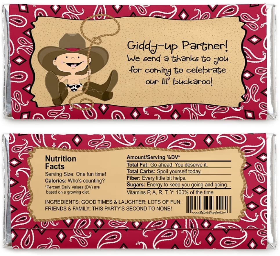 • PREMIUM PARTY SUPPLIES: Little Cowboy chocolate candy bar wrappers are professionally printed on heavy-duty paper with a photo-like shine. They are individually inspected and carefully packaged by hand with silver foil wraps. Follow the included instructions to quickly wrap a foil around each chocolate candy bar and then add the printed paper wrapper, securing with tape.