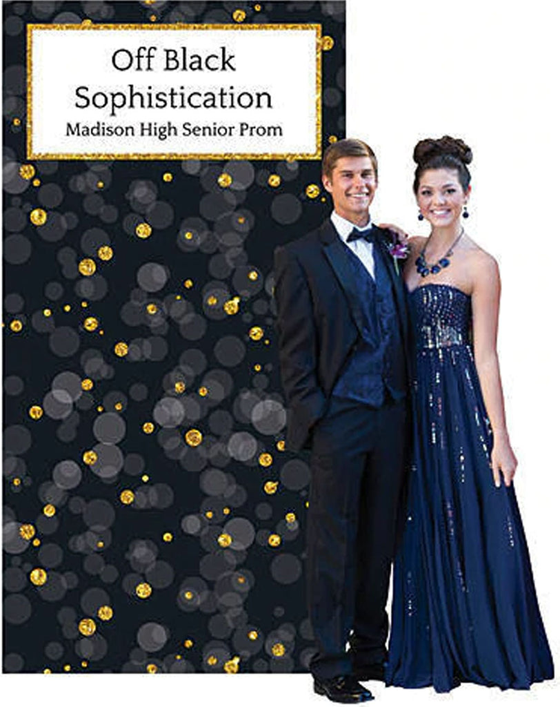 Our Off Black Sophistication Personalized Photo Booth Background features a printed gold glitter dot design on a black background. All you need to do is add your custom wording to the Off Black Sophistication Photo Background for a personal touch to your photos at your event.