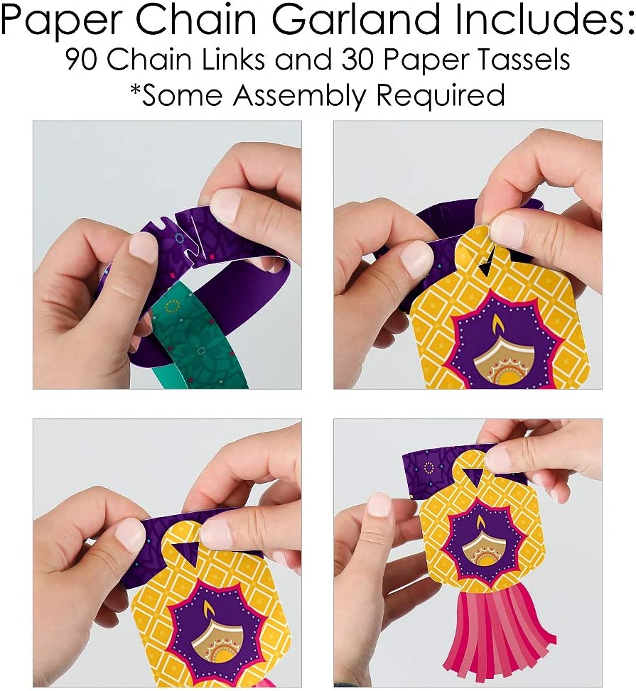 • SIMPLE ASSEMBLY: Happy Diwali paper chain decoration kit will arrive flat and is easy enough for the whole family to assemble. First, form a chain link into a circle and insert the tab through the slit. Slide the next chain link through the first link and repeat until all chain links are connected, forming a paper chains garland. Attach paper tassels by inserting paper tassel through center slit located on the chain link.