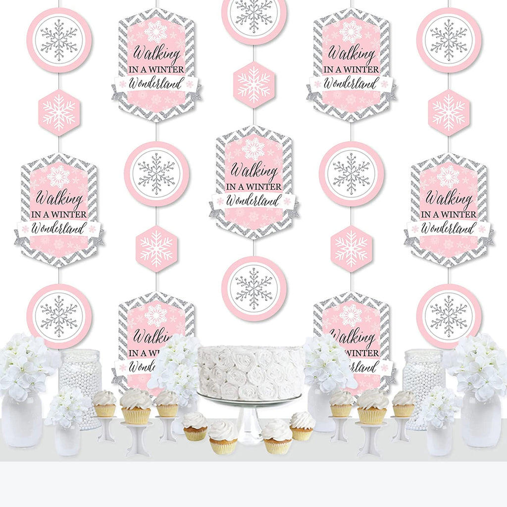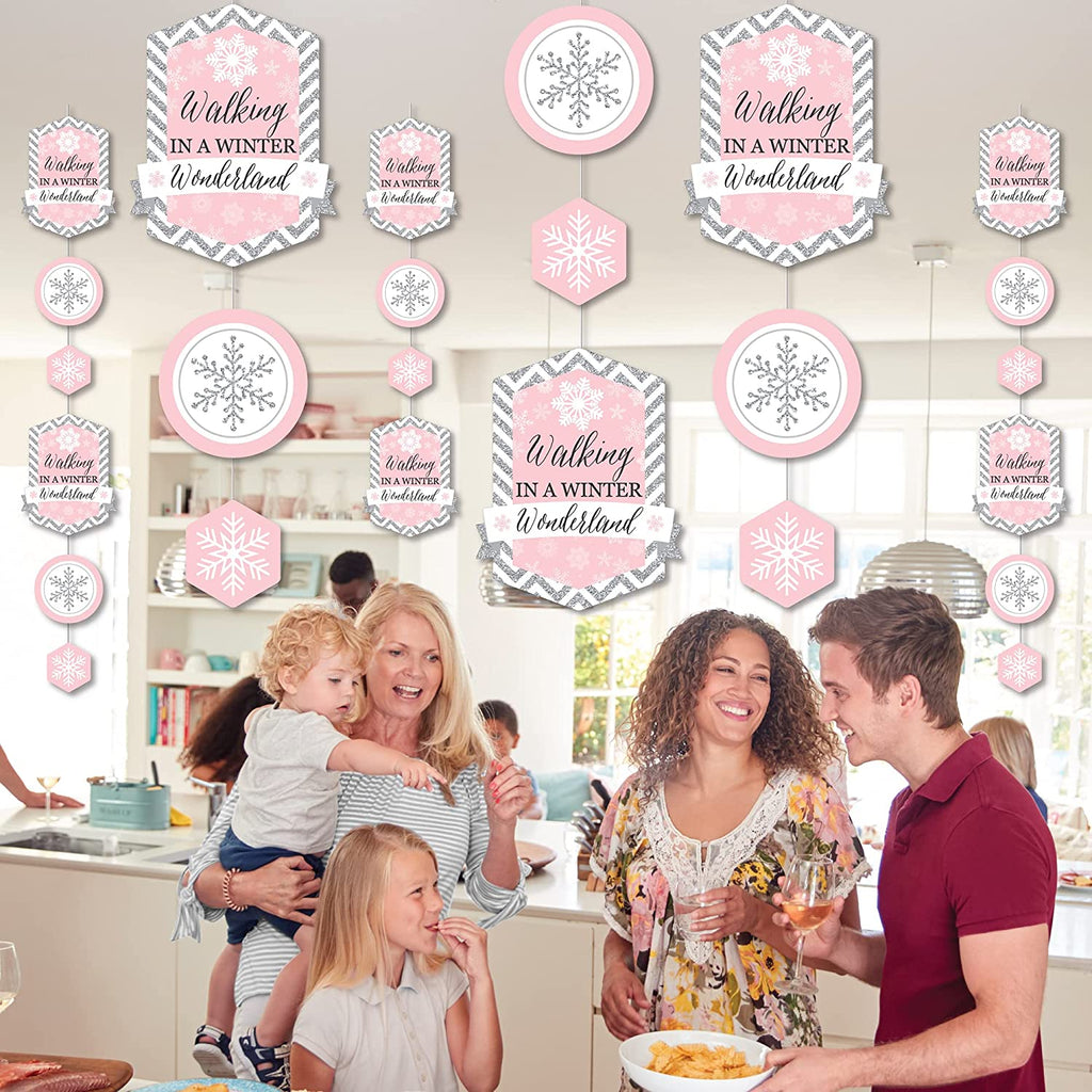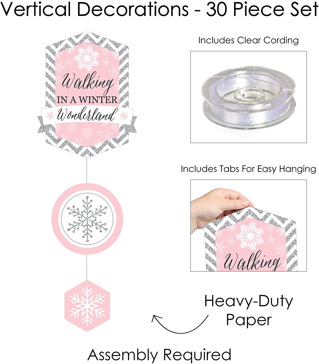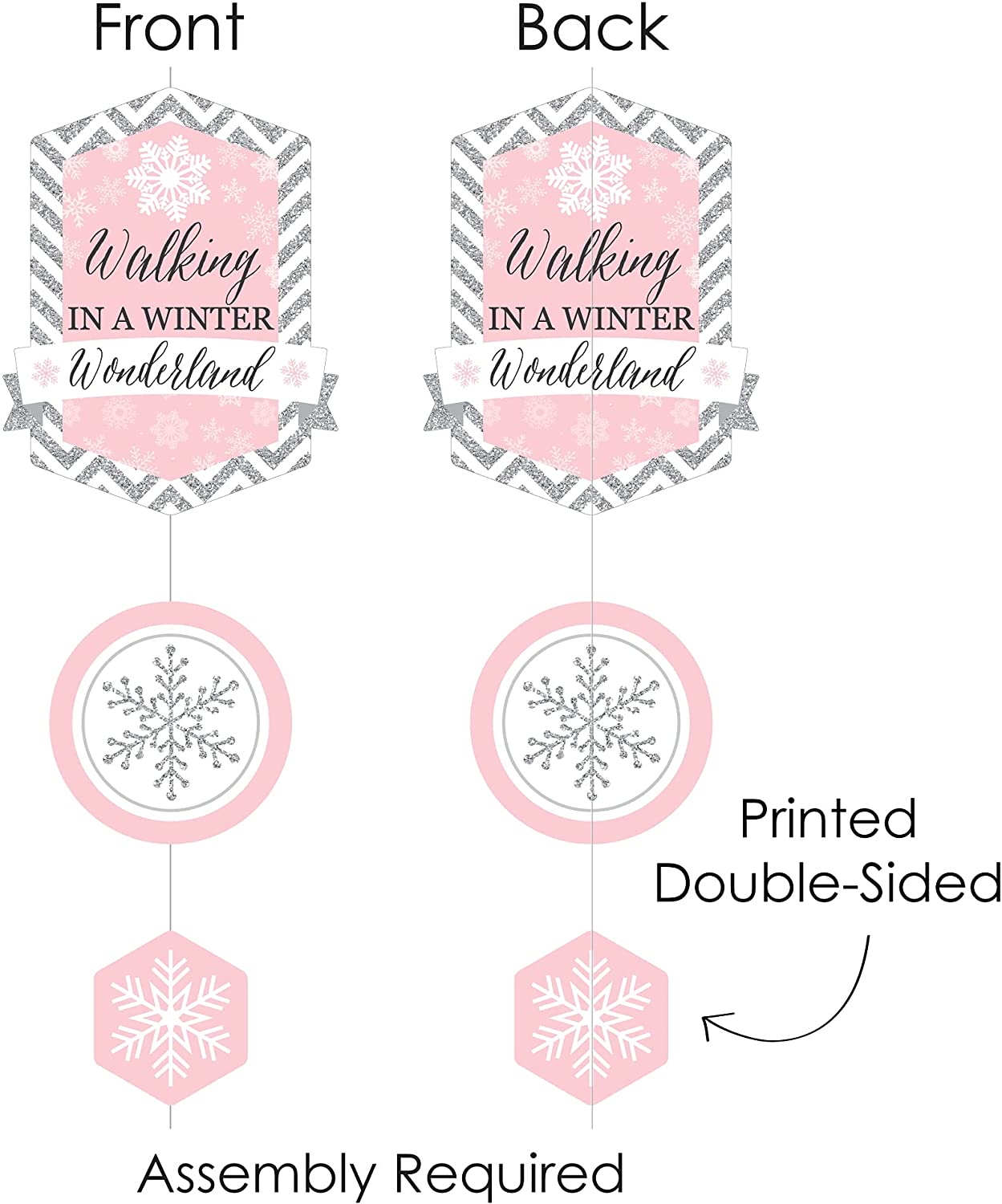 • HIGH-QUALITY DECOR: Pink Winter Wonderland Hanging Vertical Decorations are professionally printed on heavy-duty cardstock paper. Each piece is individually inspected and carefully packaged by hand. Requires some simple do-it-yourself assembly. Use provided clear cording to display decorations however you prefer.