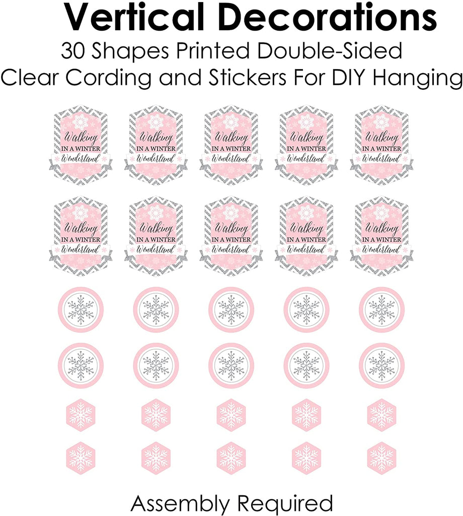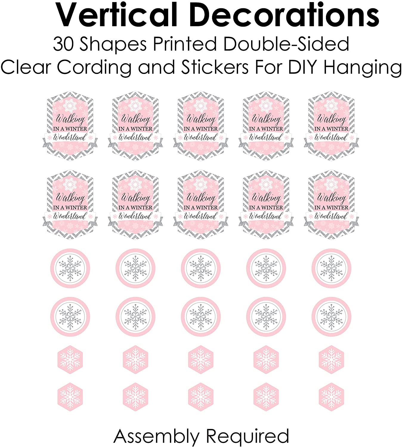 • Pink Winter Wonderland Hanging Vertical Decorations INCLUDE 30 shaped pieces, 1 roll clear cording, and assembly stickers. Pink Winter Wonderland Vertical Decorations are fun and versatile party danglers for your next holiday snowflake birthday party or baby shower event.