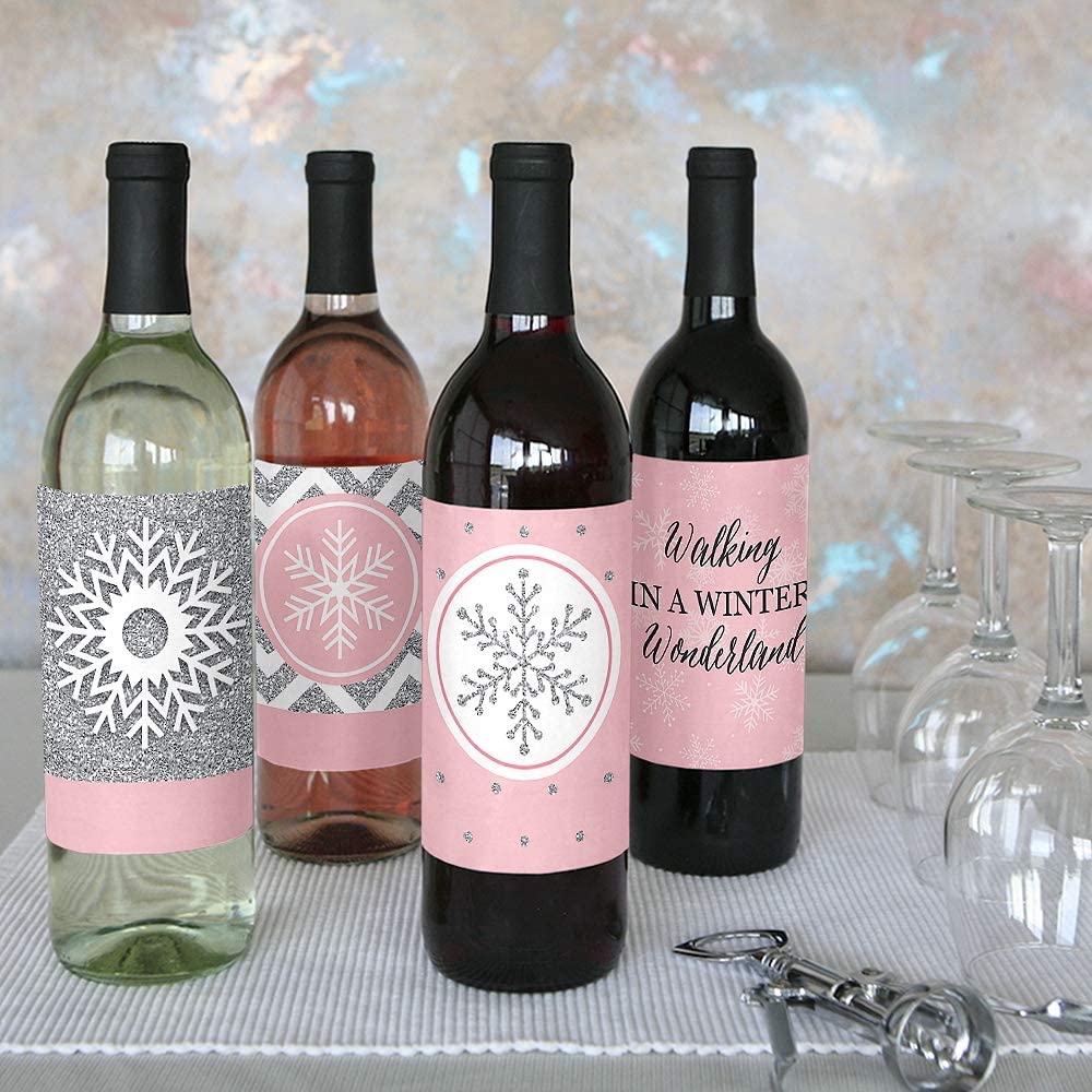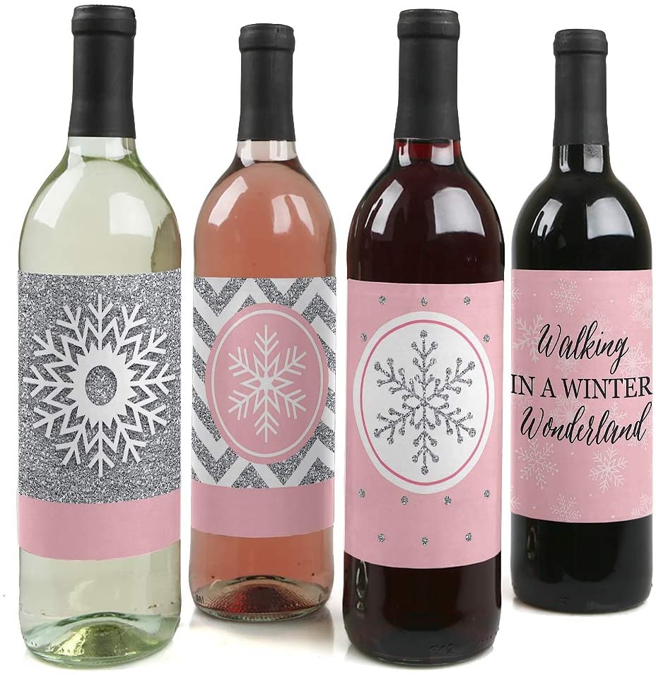 • UNIQUE GIFT IDEA: Pink Snowflake Wine Bottle Labels also make a great gift idea. Add Pink Winter Wonderland Wine Bottle labels to a favorite bottle of wine or spirits for a special gift. Use each wine label on a favorite beverage bottle and gift individually or create an impressive gift basket using all 4 labels on coordinating wine or liquor bottles. Wine bottle labels will easily give your gift a personal touch!