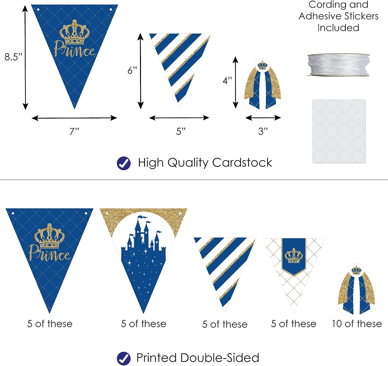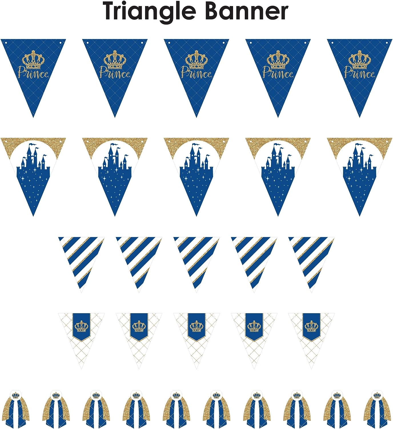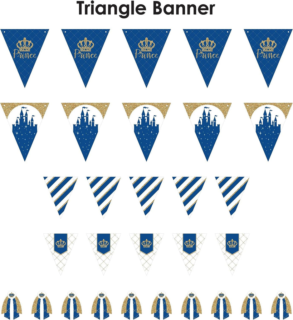 • Royal Prince Charming Triangle Banner includes a set of 20 paper triangle flags, 10 paper tassel shapes, satin cording, and adhesive stickers. Make a fun garland banner that will look amazing at your baby shower or birthday party.
