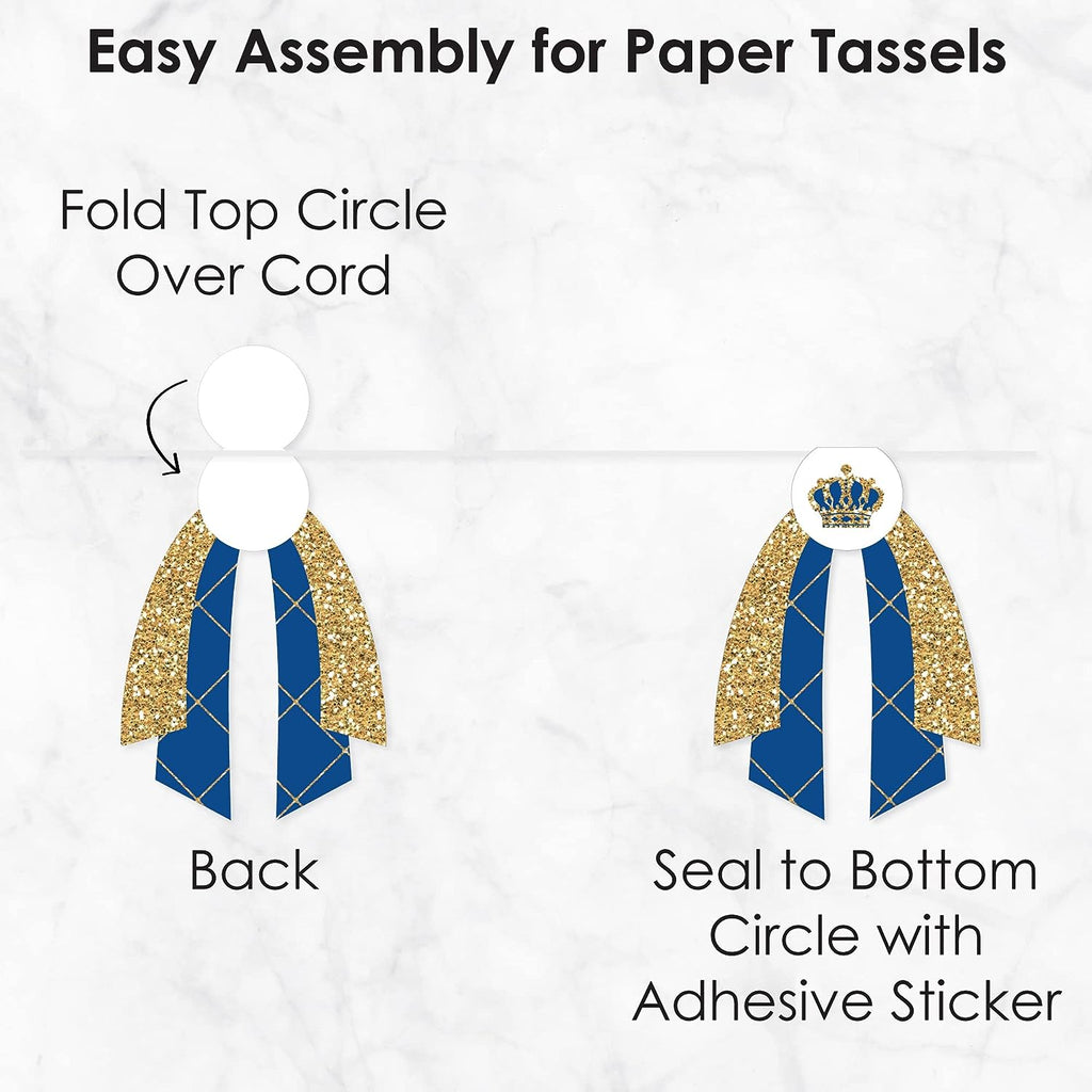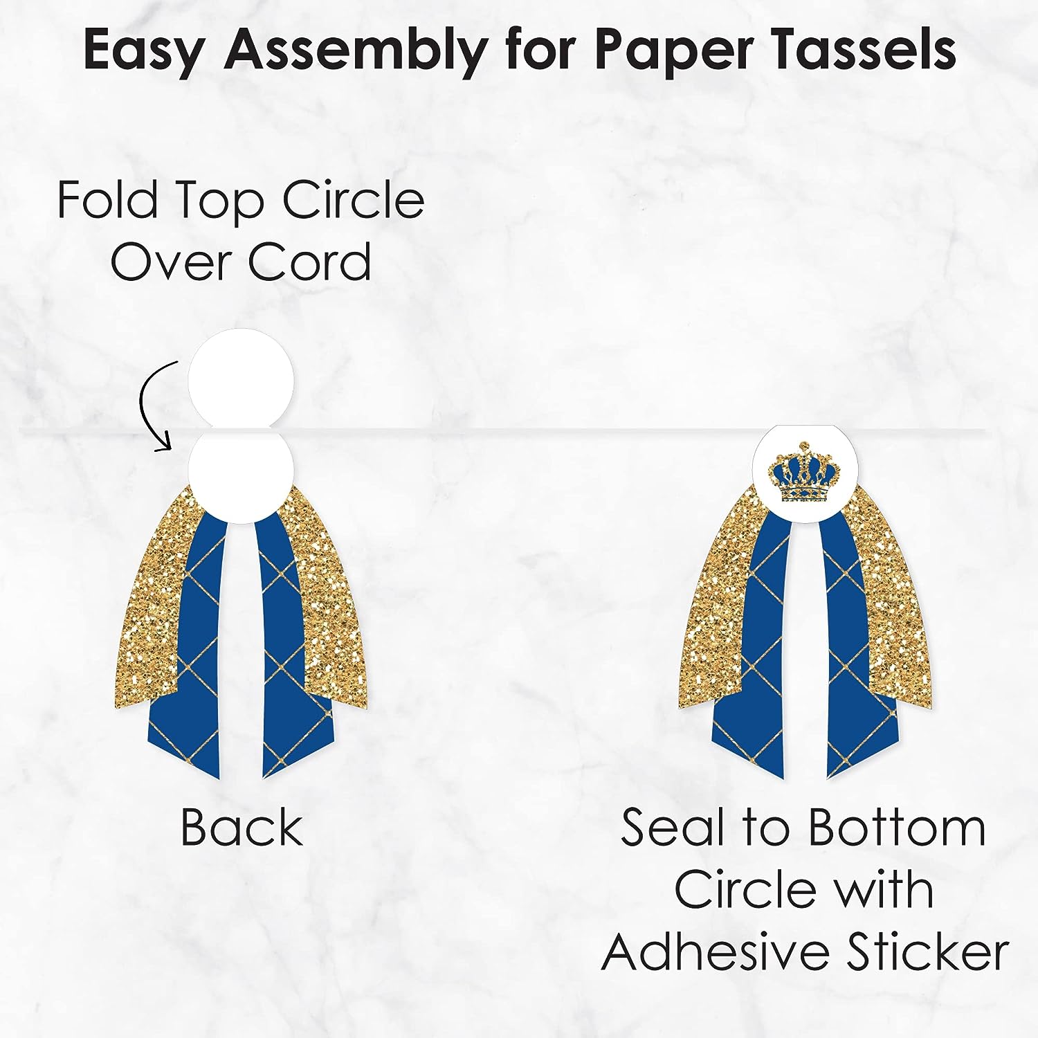 • DIY Assembly: Royal Prince Charming banner is easy to put together. Simply string the cording through the punched holes on each pennant piece and add the paper tassels using the included adhesive dots. Secure the triangle banner by tying the ends into a knot and hang the banner using an included clear circle sticker. Instructions included on packaging.