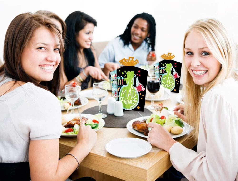 • EASY TABLE DECOR: Each Scientist Lab centerpiece SIZE 5 inches wide (front/back) x 3 inches wide (sides) x 10.5 inches tall. This 10 count table decorations set requires easy folding to flare out each centerpiece at your desired look. Easy DIY folding assembly: Use a flat surface to fold along the scored creases to stand the centerpiece upright and be able to balance on its own.