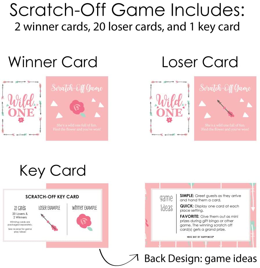 • FUN PARTY GAME: She’s a Wild One scratch-off cards will be enjoyed by birthday party guests of all ages. Each game card measures 2.75” tall x 4.75” wide. Winner and loser game cards are packaged separately so it is easy to pre-select the game winners if you choose.