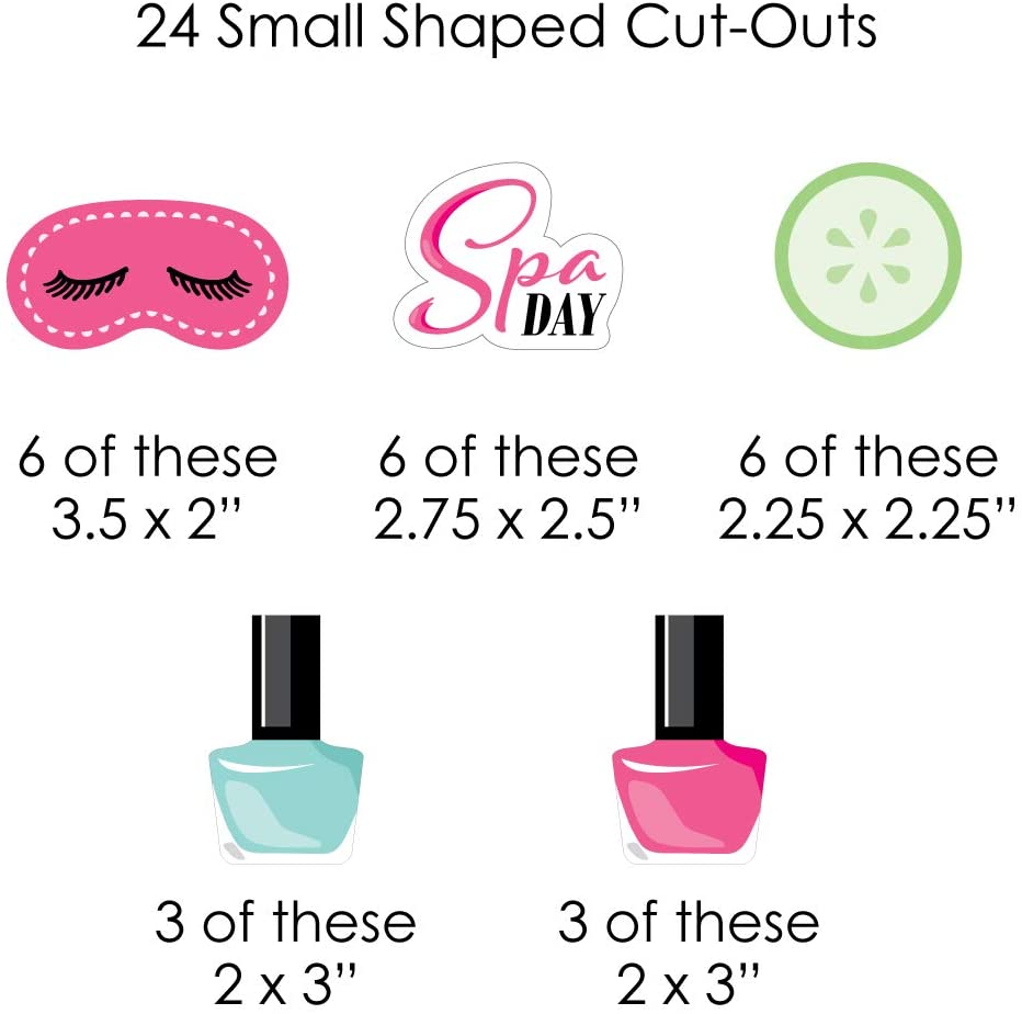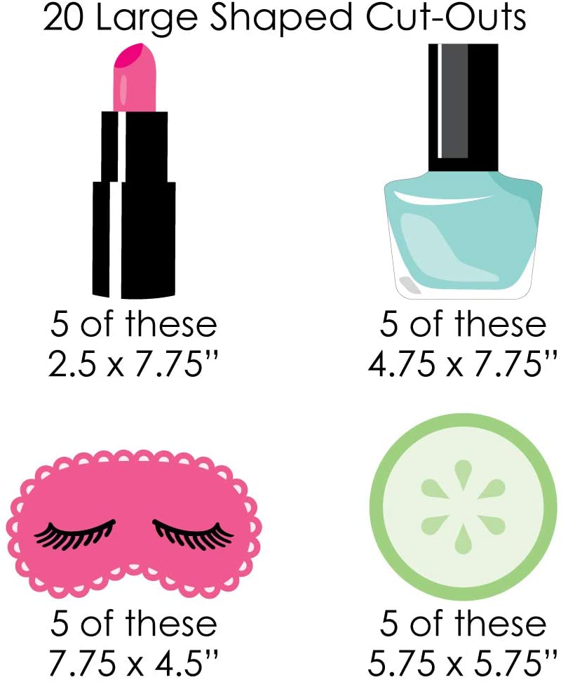 • DIY PARTY SUPPLIES: Spa Day small paper shaped cut-out SIZE 6 eye mask paper die cuts (3.5” X 2”); 6 spa day (words) paper die cuts (2.75” x 2.5”); 6 cucumber paper die cuts (2.25” x 2.25”); 6 nail polish paper die cuts (2” x 3”). Spa Day large paper shaped cut-outs SIZE 5 lipstick shapes (2.5" x 7.75”); 5 nail polish shapes (4.75” x 7.75”); 5 eye mask shapes (7.75” x 4.5”); 5 cucumber shapes (5.75” x 5.75”).
