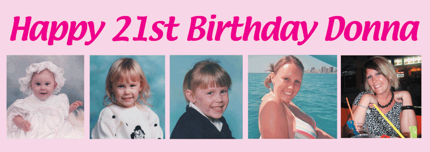 Another popular birthday banner with up to 6 photographs on a theme of this is your life. Photographs usually from birth to now but banner also looks good with a mix of up to 6 recent pictures. Any colour background and words. Upload the photographs in the order you want them to appear on the banner. Most often used for 21st, 30th, 40th, 50th and 60th birthdays.