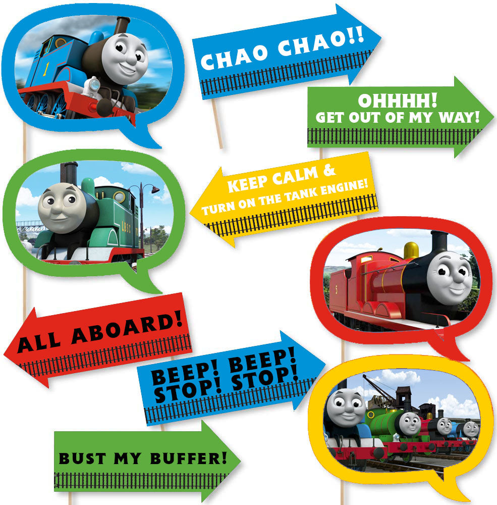 • 10-Piece Funny Thomas The Train Photo Booth Props Kit INCLUDES 10 Thomas The Train arrow and speech bubble photo booth props, 10 wooden dowel sticks and stickers for assembly. EASY ASSEMBLY: Simply attach the printed DIY photo booth props to the wooden dowels with included adhesive and reinforcing stickers.