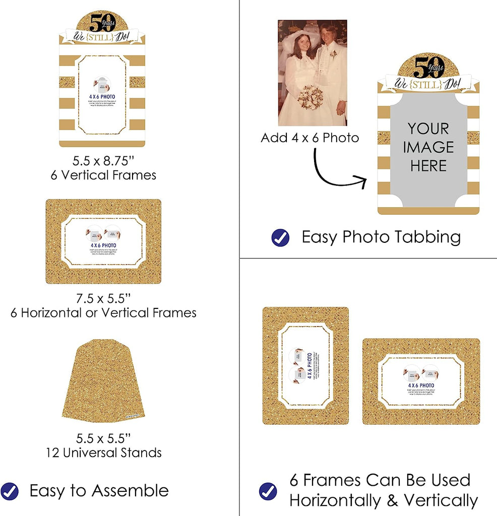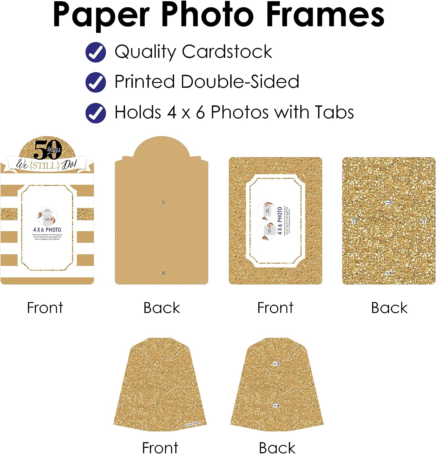• We Still Do - 50th Wedding Anniversary Paper Photo Frames includes a set of 12 picture frames with stand that are suitable for 4x6 photographs. Six vertical frames come with a round-shaped top and the other six frames come in a standard rectangular shape that can be displayed horizontally or vertically.