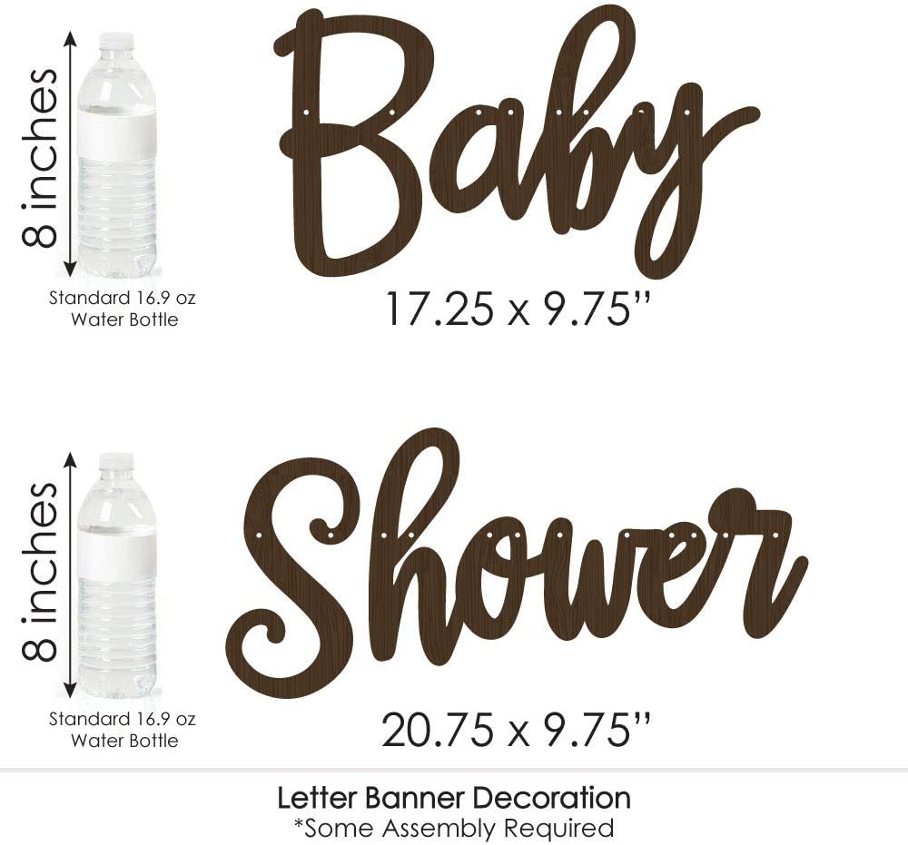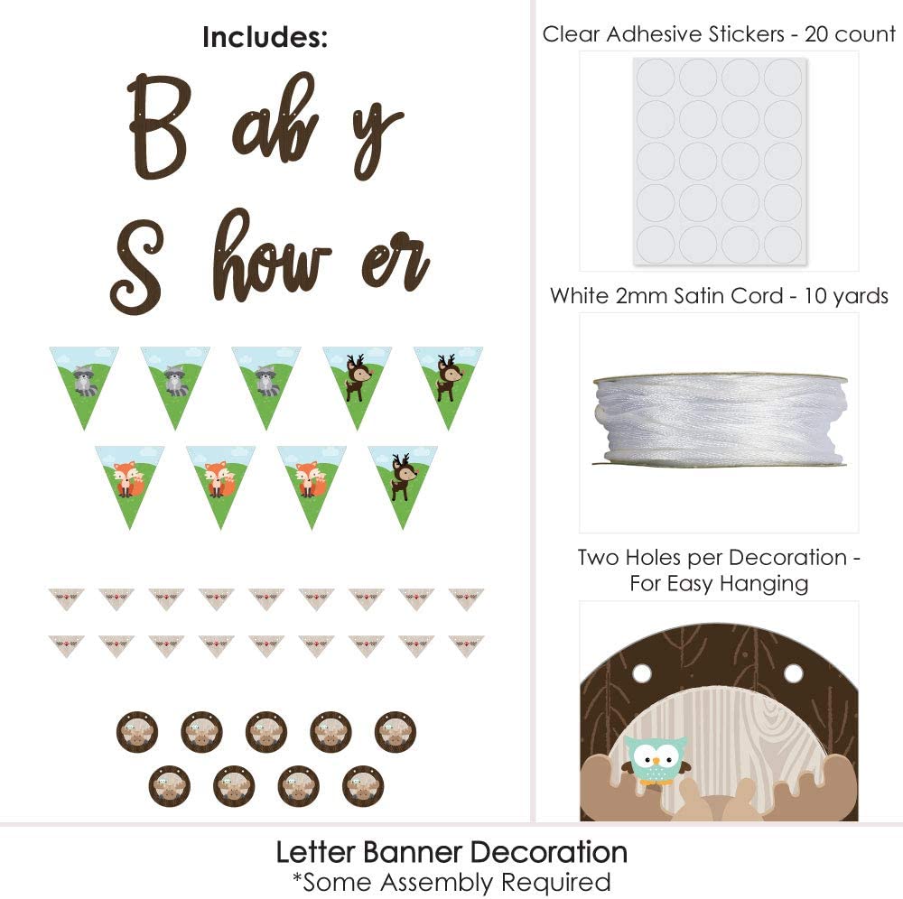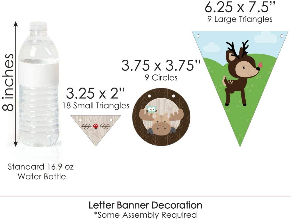 • VARIETY OF DESIGNS & SIZES! Woodland Creatures Baby Shower Letter Banner features coordinating pennant pieces and script letters. Decorate your event with 9 large triangle pennants (6.25” x 7.5”); 9 circle pennants (3.75” x 3.75”); 18 small triangle pennants (3.25” x 2”); and baby shower letters in script style lettering. Easily string them together with the included 10 yards of satin cording.