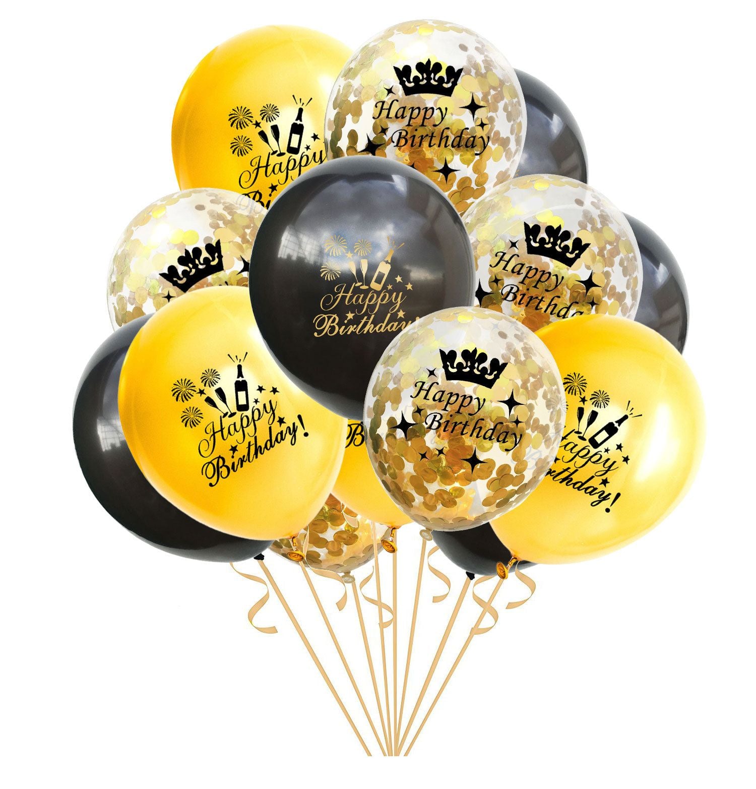 五彩纸屑气球乳胶透明生日气球(生日快乐)- 金色和黑色 - 15 个气球 - 含氦气