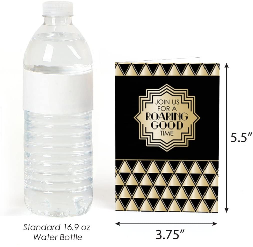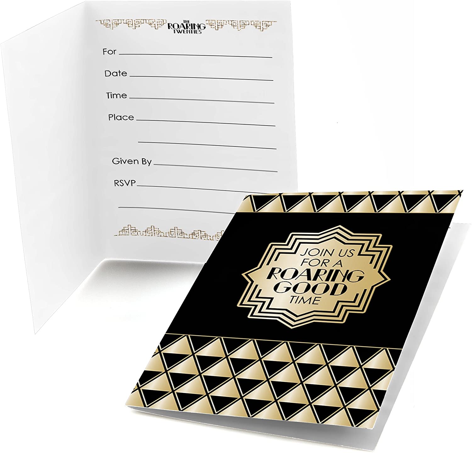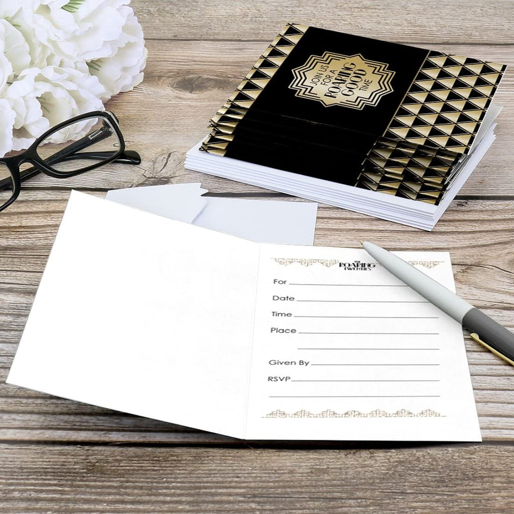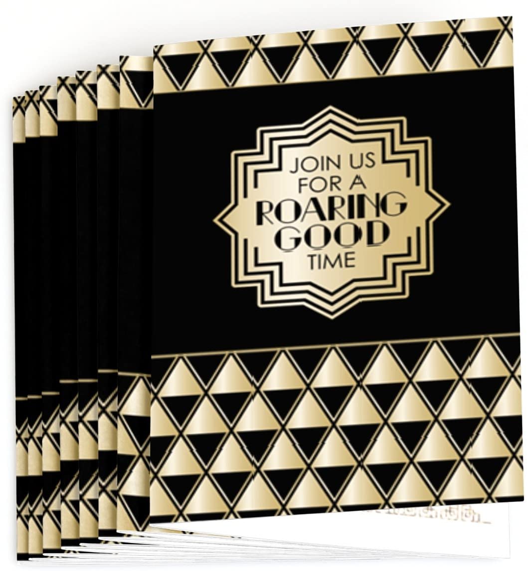 1920 年代装饰艺术爵士乐填空邀请函套装包含 8 张“咆哮的二十年代”派对邀请函和优质白色信封。二十年代主题非常适合 1920 年代装饰艺术爵士乐派对。