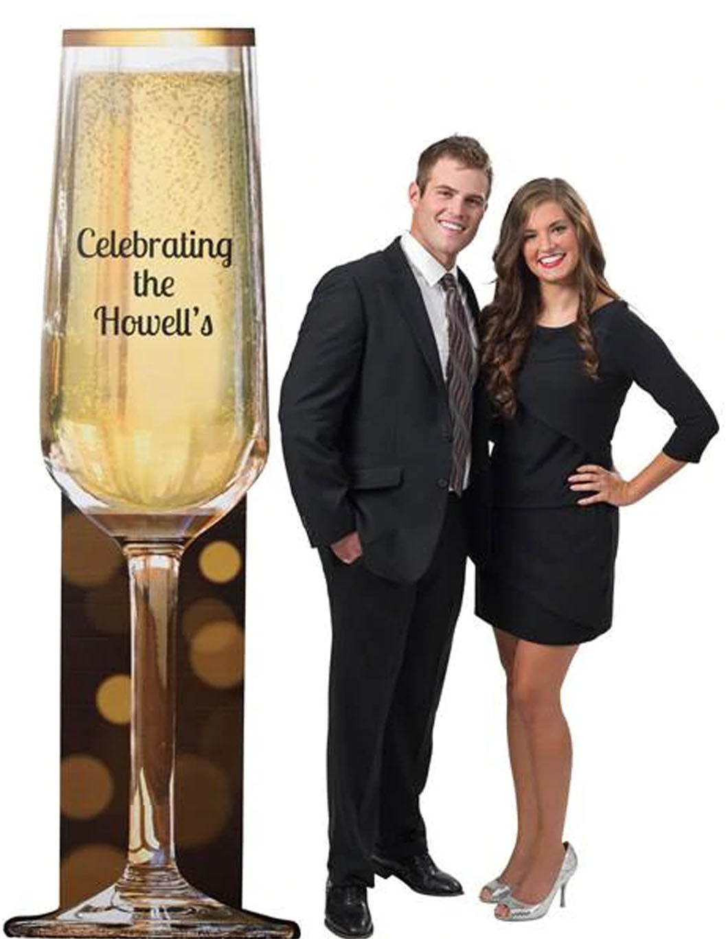 用这款精美的香槟杯个性化立牌来迎接您的宾客吧!香槟杯背景上印有您的专属信息,不仅能为装饰增添时尚气息,还能成为绝佳的拍照点缀。
