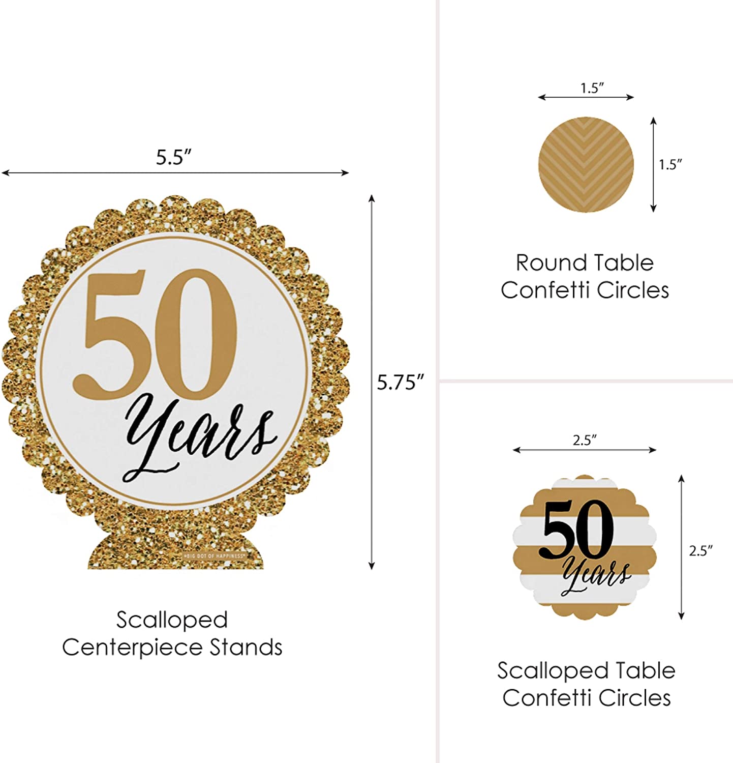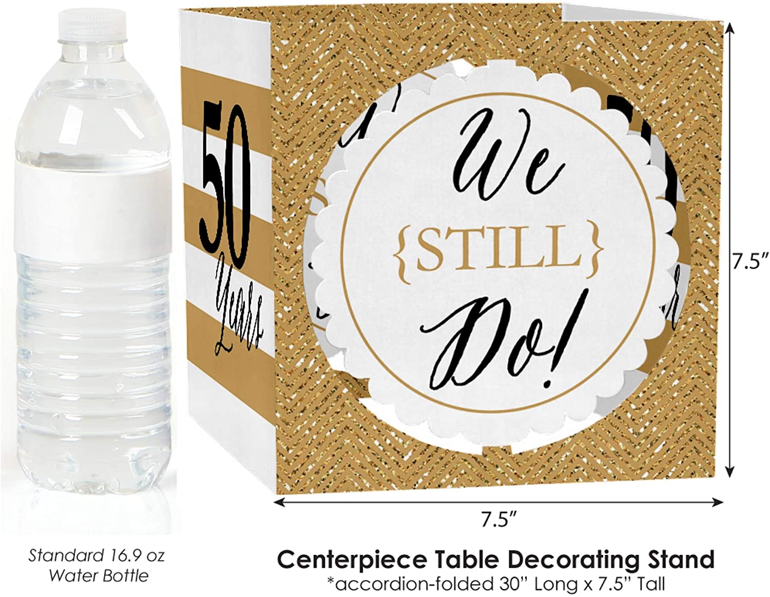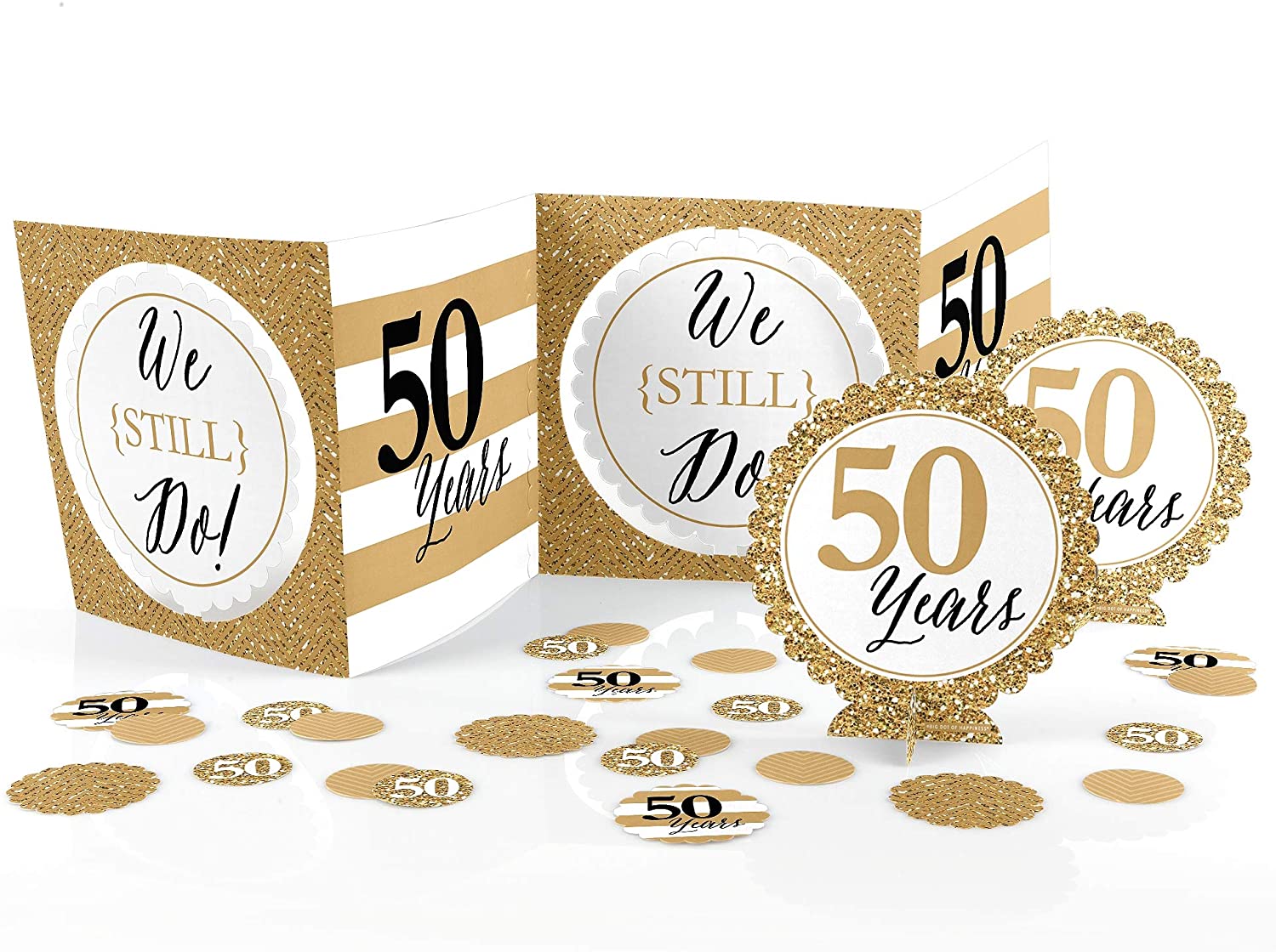 We Still Do 派对装饰套装尺寸:1 个风琴折叠式中心装饰(也可使用随附贴纸将其拼成立方体),长 30 英寸 x 高 7.5 英寸;2 个扇形中心装饰支架,宽 5.5 英寸 x 高 5.75 英寸;12 个扇形桌面五彩纸屑圈,直径 2.5 英寸;以及 24 个圆形桌面五彩纸屑圈,直径 1.5 英寸。独特的设计和多样的配件使这款金色 50 周年派对装饰套装成为任何周年纪念派对的令人印象深刻的点缀。