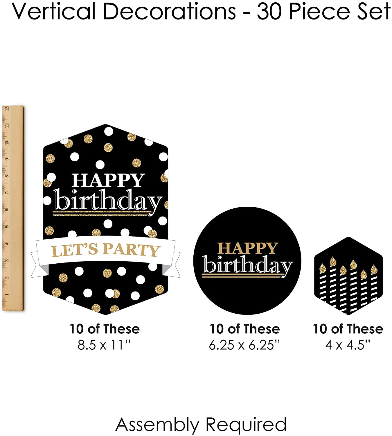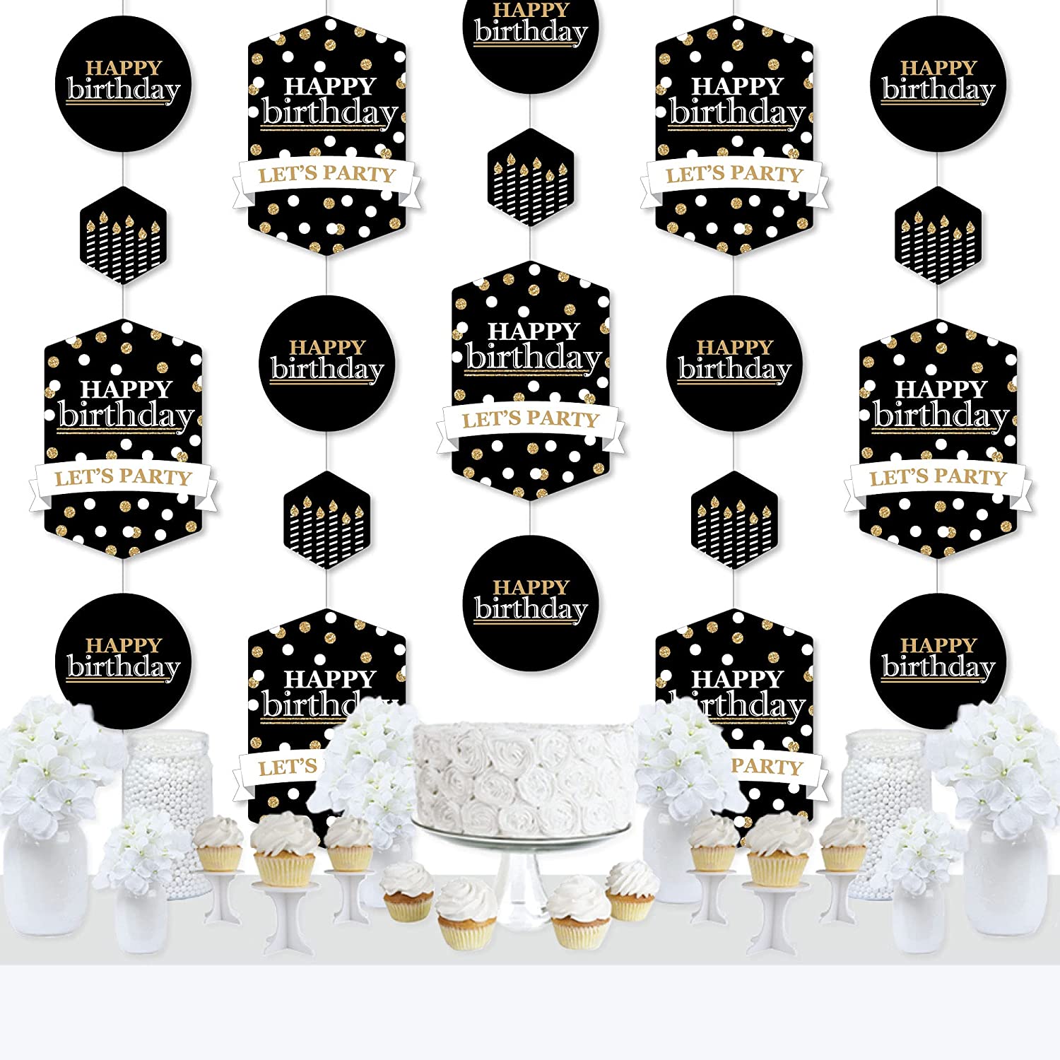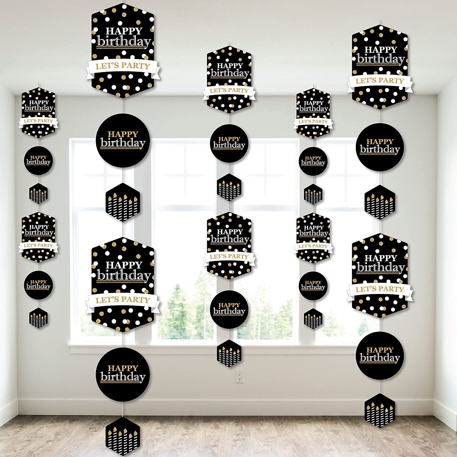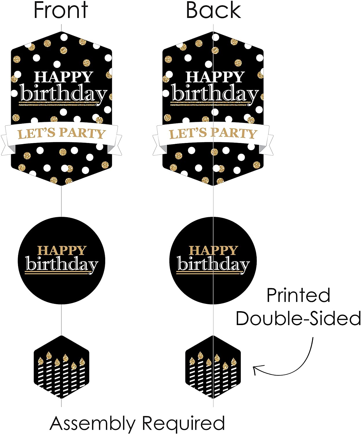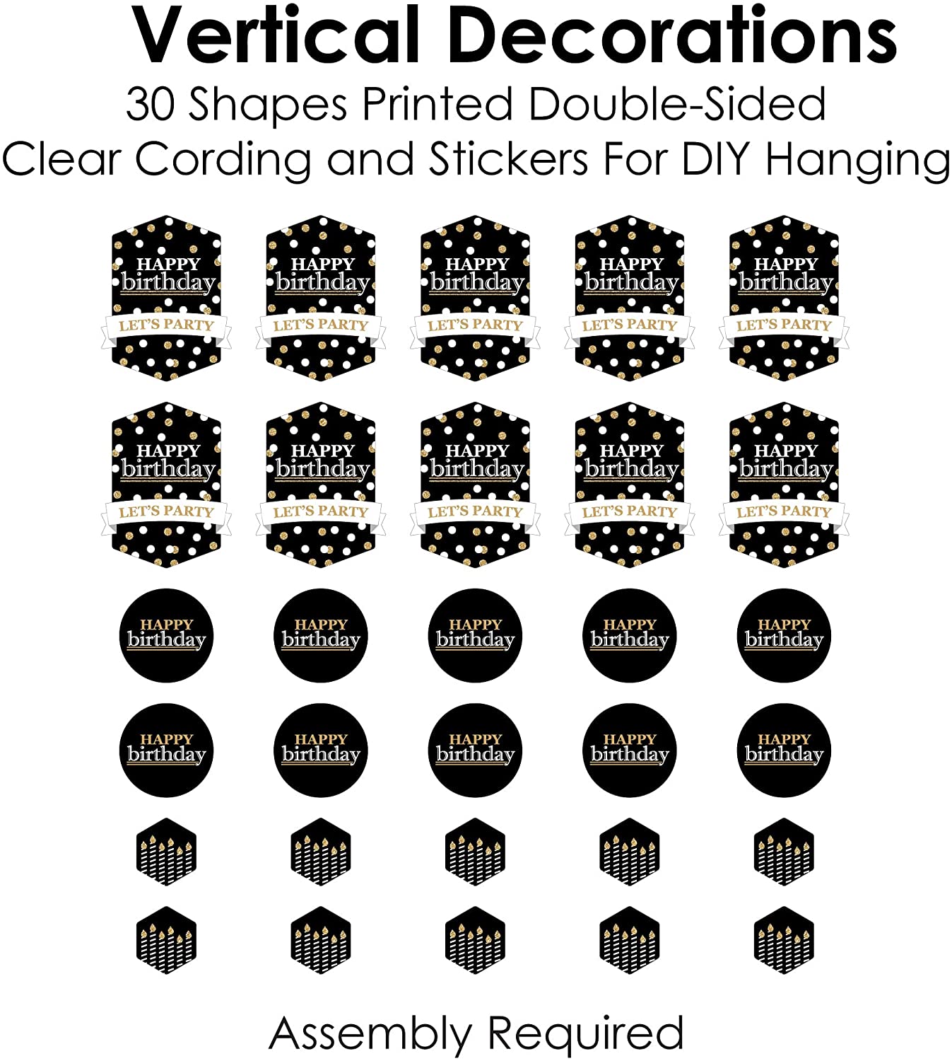 成人生日快乐 - 金色垂直悬挂装饰,包含30个异形组件、1卷透明绳和组装贴纸。成人生日快乐 - 金色垂直装饰是您下次生日派对上充满乐趣和多功能的派对吊饰。