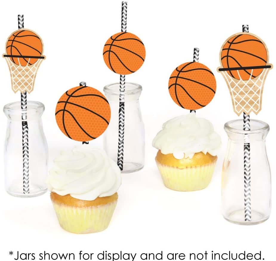 Nothin' But Net - 篮球吸管装饰包含 24 个运动剪纸、25 根配套纸吸管和透明贴纸,方便组装。是的,您将额外获赠一根吸管。篮球 DIY 派对用品非常适合迎婴派对、生日派对或毕业派对。
