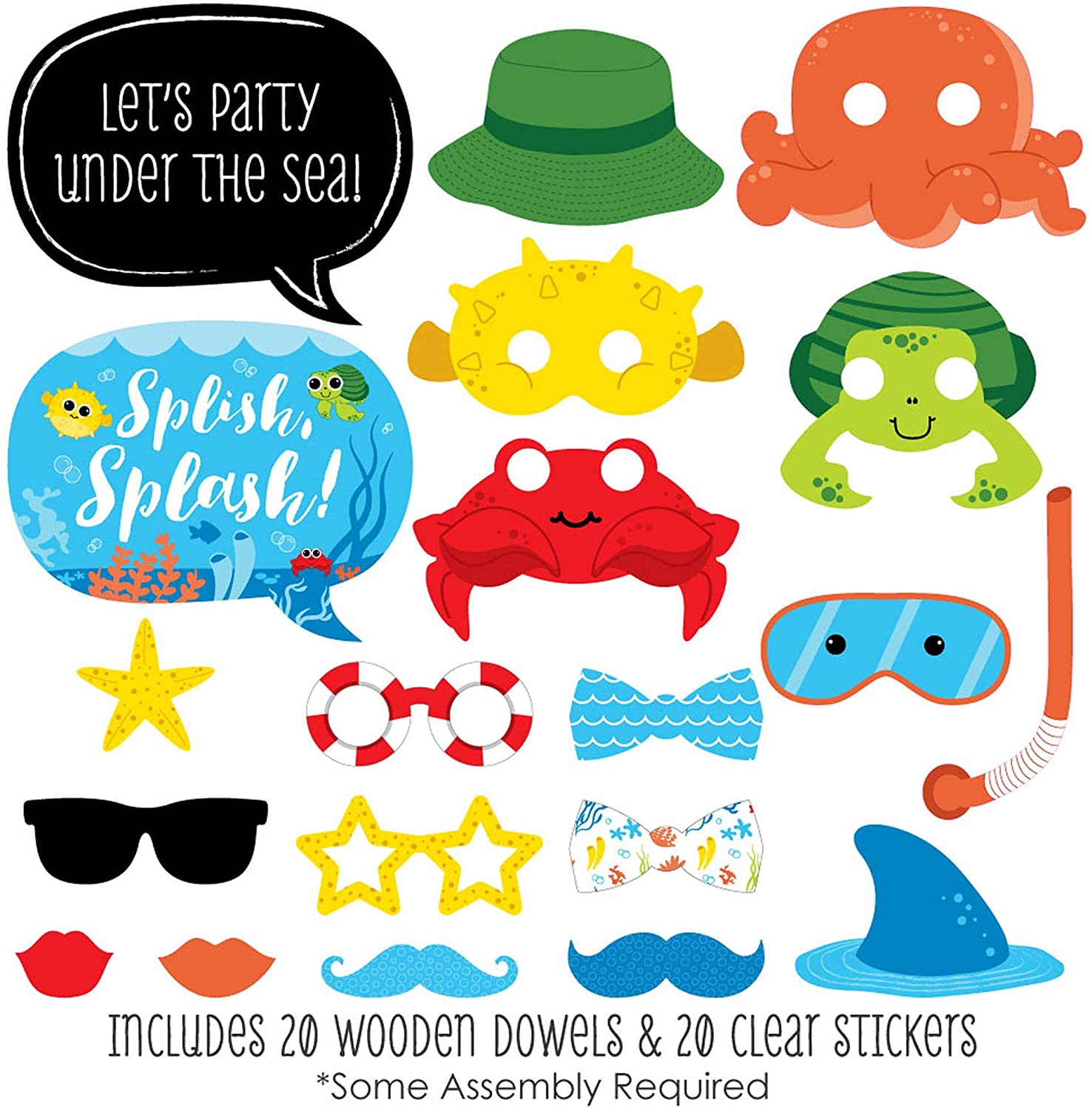 20件套婴儿洗礼或生日派对照相亭道具套装,包含20个海底小动物照相亭道具、20根木钉以及组装用粘合剂。组装简便:只需将印好的DIY照相亭道具用附带的粘合剂和加固贴纸粘贴到木钉上即可。