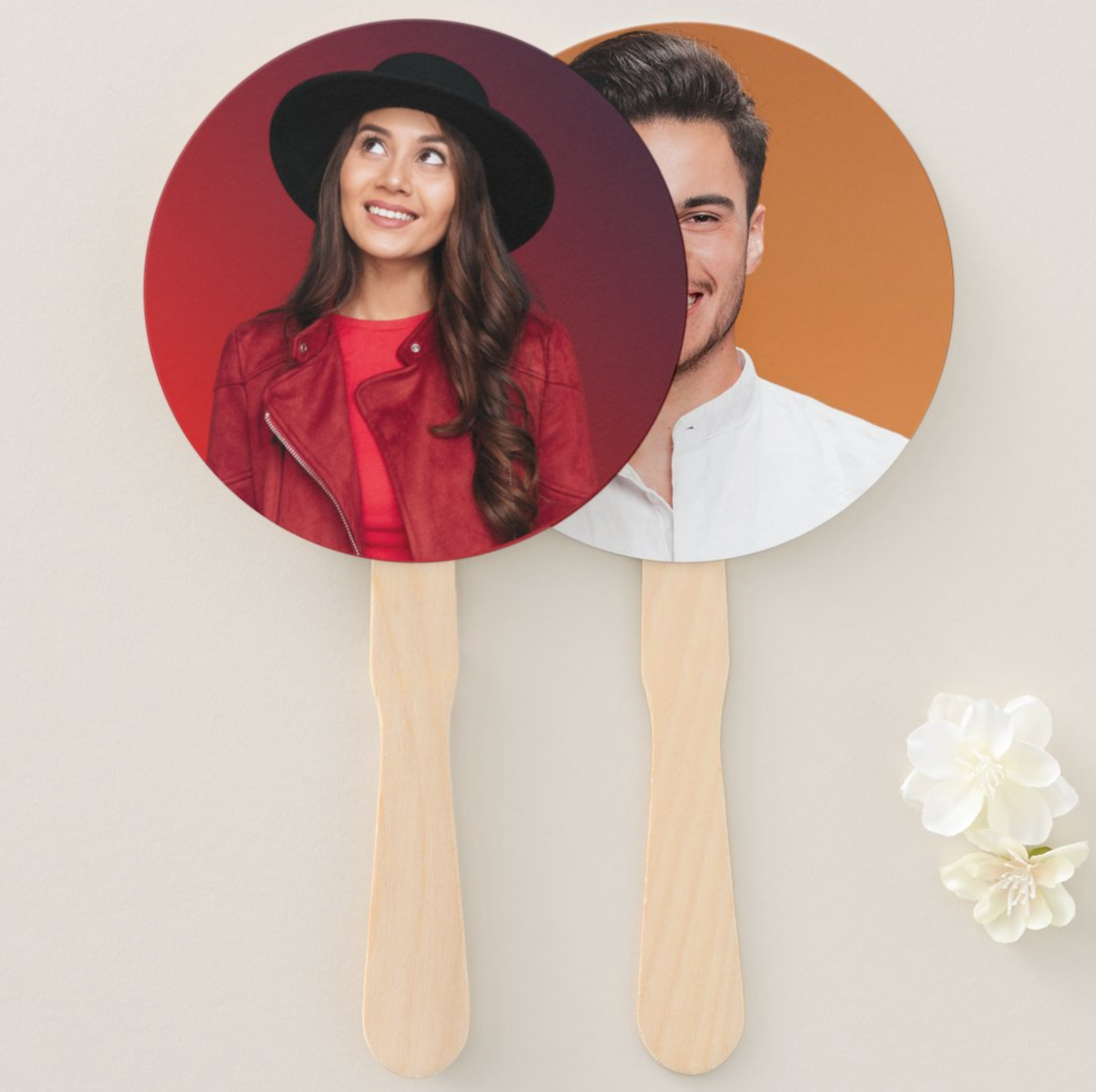 “我的天哪!”婚礼太热了(比喻,不是字面意思),你的宾客肯定需要一把风扇来降温。定制合适的风扇, 拥有并持有。