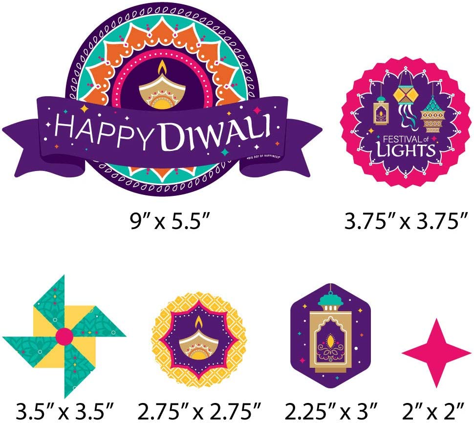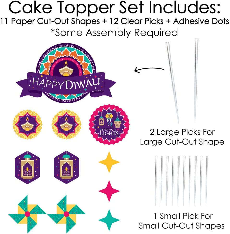 排灯节快乐蛋糕装饰套装包含:11 个结实的卡纸剪纸片、12 个透明拨片和一张用于快速组装的粘点纸。需要进行一些组装。