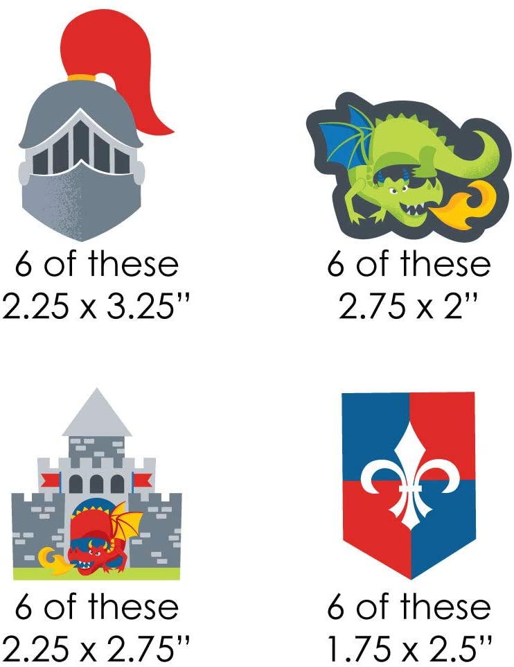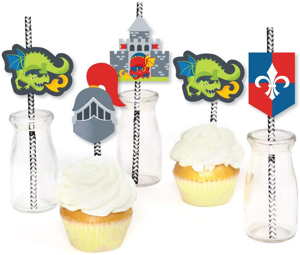 中世纪吸管装饰派对套件尺寸:6 个头盔纸模切(2.25 英寸 X 3.25 英寸);6 个龙纸模切(2.75 英寸 x 2 英寸);6 个城堡纸模切(2.25 英寸 x 2.75 英寸);6 个盾牌纸模切(1.75 英寸 x 2.5 英寸)和 25 根 7.75 英寸高的 V 形条纹纸吸管。