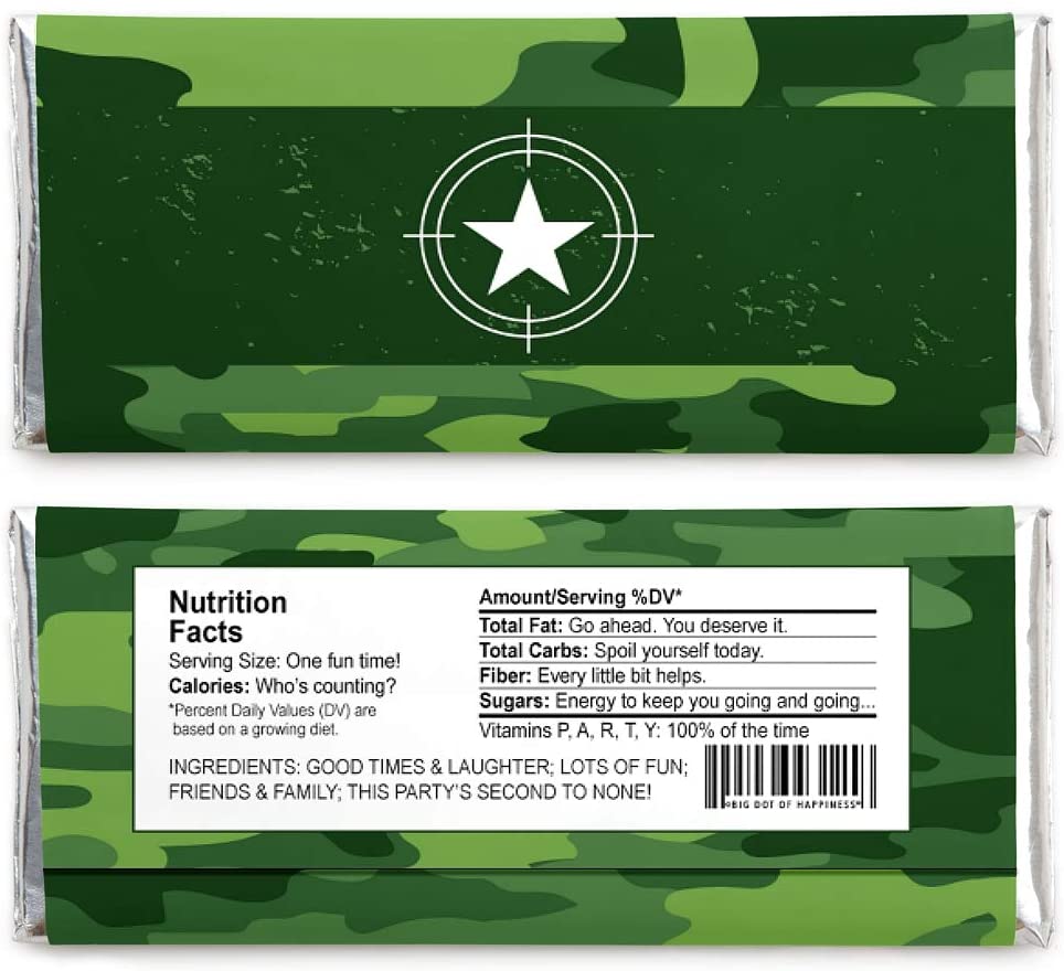 Camo Hero 标准糖果棒包装套件包括 24 个巧克力棒包装纸和 24 个箔纸,非常适合打造可爱的军用糖果自助餐或独特的迷彩婴儿洗礼或生日派对礼物。