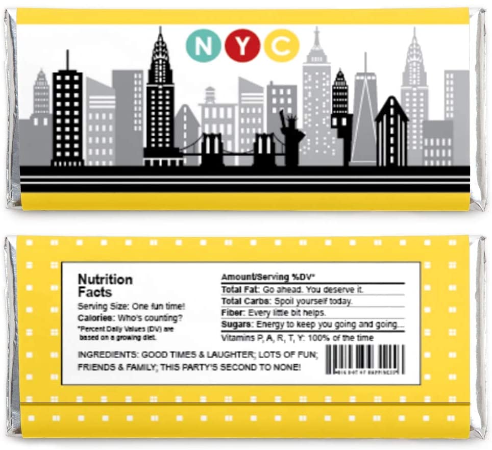 NYC Cityscape 标准糖果棒包装套装包括 24 个巧克力棒包装纸和 24 个箔纸,非常适合打造可爱的“我爱纽约”糖果自助餐或独特的纽约市派对礼物。
