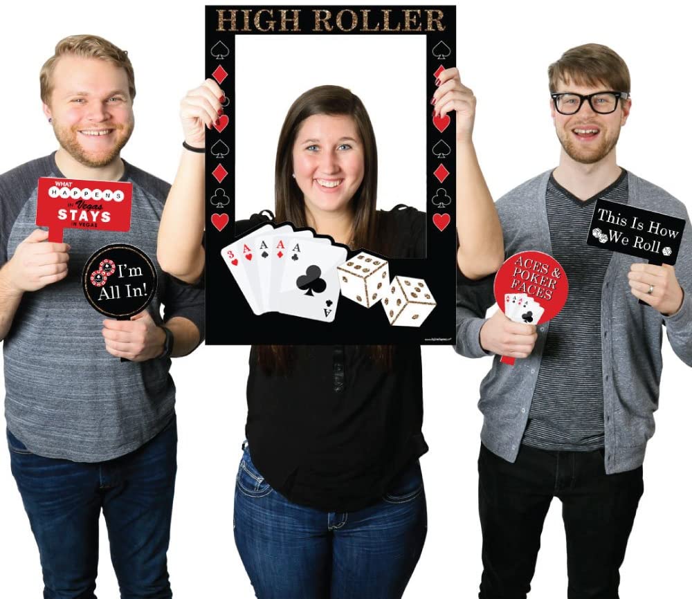 高品质派对用品:拉斯维加斯赌场派对拍照亭道具采用专业印刷,印制于耐用的瓦楞塑料板上。到货即剪,可立即使用。拉斯维加斯拍照亭相框及道具防水,可在户外、任何天气和任何地点使用。