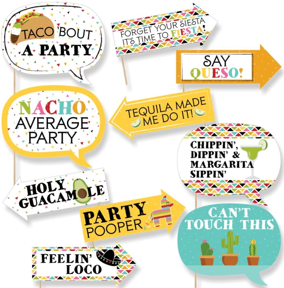 10件套趣味“Let's Fiesta”拍照亭道具套装,包含10个墨西哥节日箭头和对话泡泡拍照亭道具、10根木钉以及组装所需的粘合剂。组装简便:只需将印好的DIY拍照亭道具用附带的粘合剂和加固贴纸粘贴到木钉上即可。