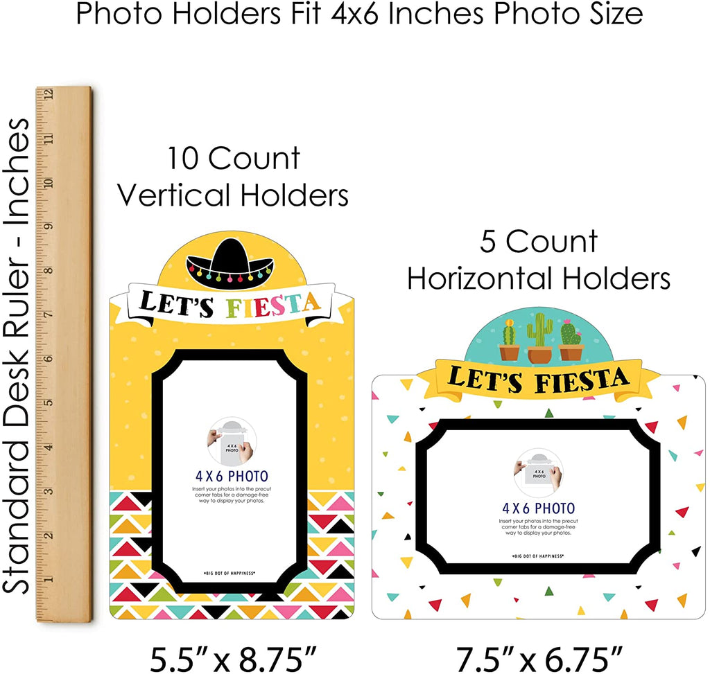 高级派对装饰:Let's Fiesta 照片桌面装饰采用专业双面印刷,印于厚实卡纸上。这套纸质相框包含 10 张竖式照片展示架,尺寸为 5.5 英寸宽 x 8.75 英寸高,以及 5 张横式照片展示架,尺寸为 7.5 英寸宽 x 6.75 英寸高。每个照片架可放置您自己尺寸的 4x6 张照片。内含 15 根木钉,每根高 12 英寸。需要自行组装。