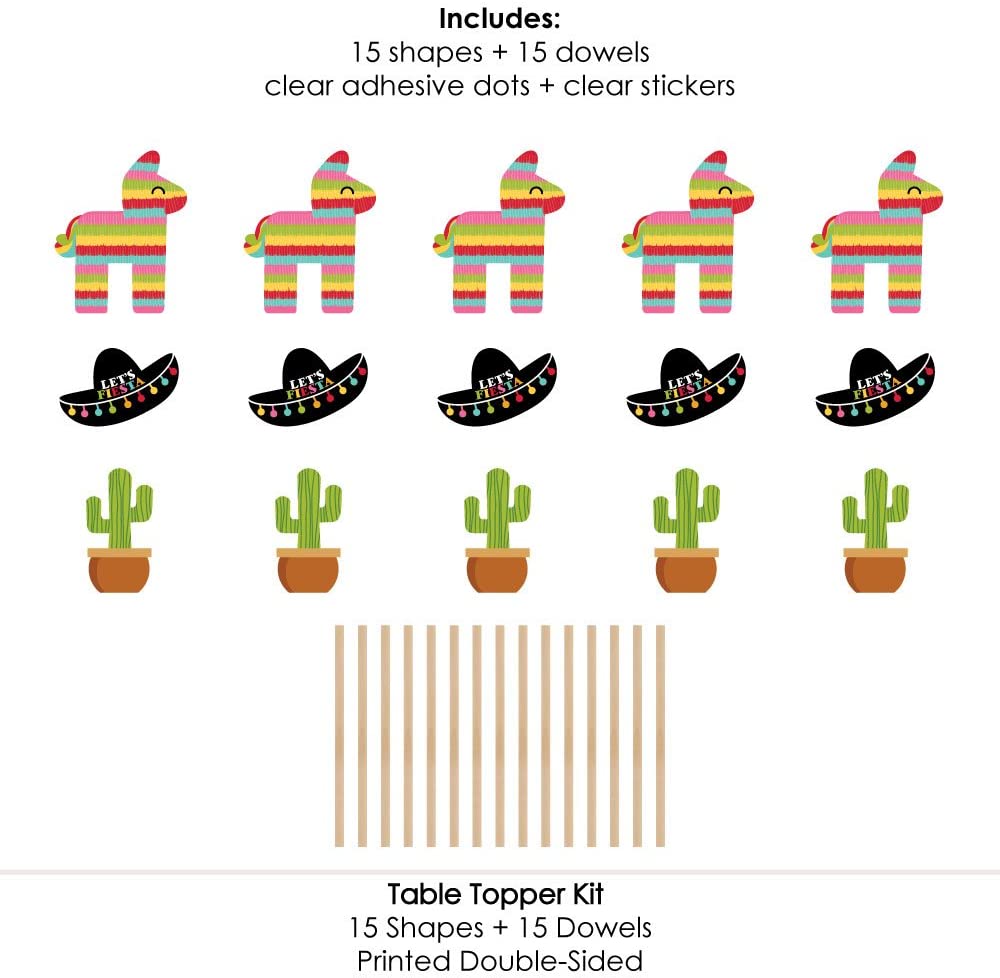 Let's Fiesta 餐桌装饰棒包含 15 个 Let's Fiesta 桌面装饰(三种不同形状)、15 根木钉以及方便组装的贴纸。墨西哥节日派对餐桌装饰非常适合五月五日节派对。