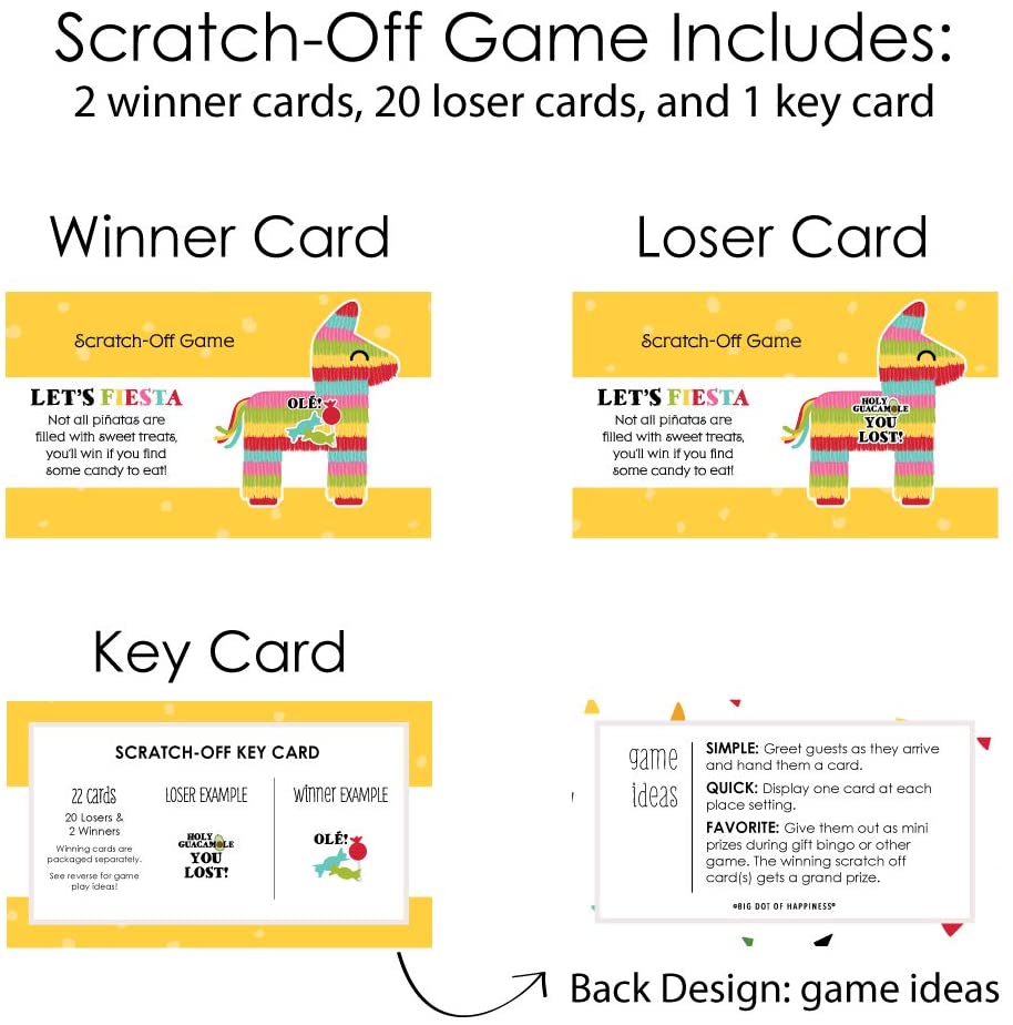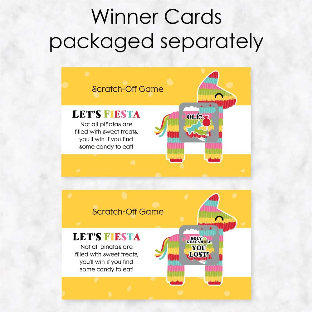 趣味派对游戏:Let's Fiesta 刮刮卡将受到各年龄段墨西哥节日宾客的喜爱。每张游戏卡尺寸为 2.75 英寸高 x 4.75 英寸宽。赢家和输家游戏卡单独包装,方便您预先选择游戏赢家。