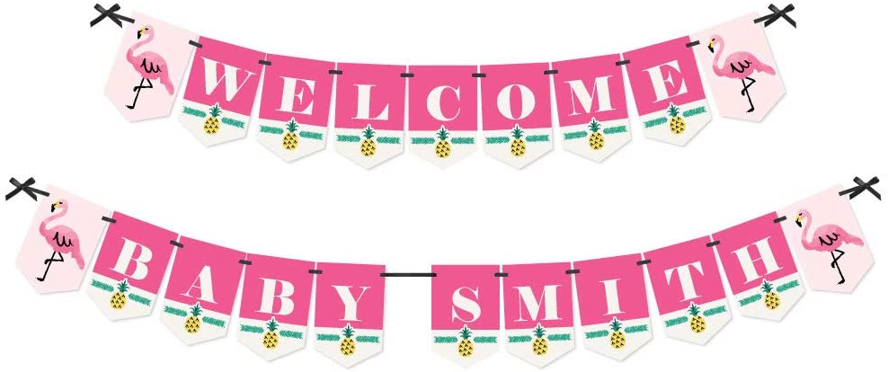 定制粉红火烈鸟 - 像菠萝一样的派对 - 个性化热带夏季婴儿淋浴彩旗横幅和装饰 - 欢迎宝宝定制姓名横幅