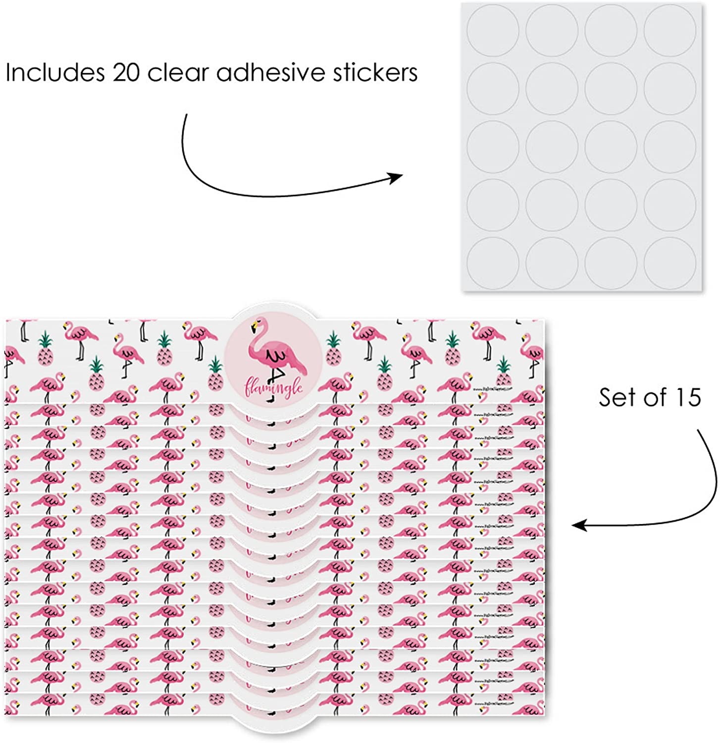 火烈鸟 - 菠萝派对DIY包装纸,包含15张“让我们一起火烈鸟派对”包装纸和20张透明贴纸。火烈鸟 - 菠萝派对DIY派对用品非常适合迎婴派对或生日派对。