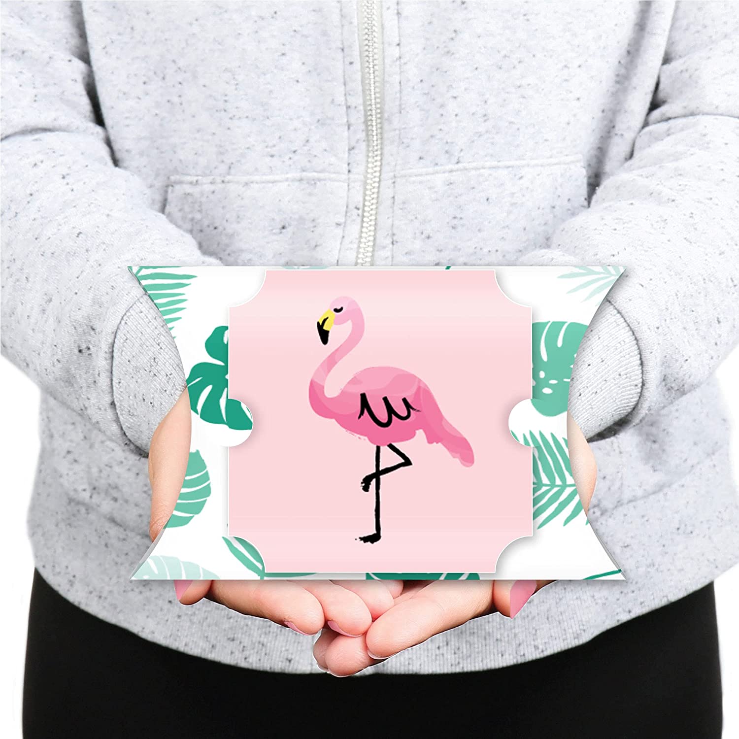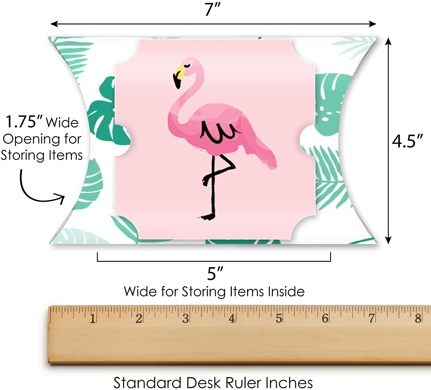 BOX-ERRIFIC:粉色火烈鸟 - 菠萝派对大号枕头盒尺寸为长 7 英寸 x 宽 4.5 英寸。组装完成后,盒子两端开口各 1.75 英寸,深 5 英寸,方便存放物品。这些礼品盒采用耐用材质制成,可装入包装好的零食、小饰品或小纪念品;适合所有年龄段。这些盒子充满趣味和艺术感,是任何派对餐桌布置的完美点缀。