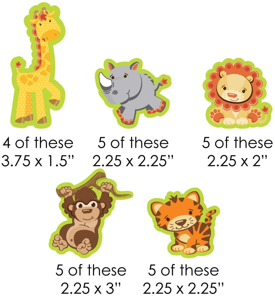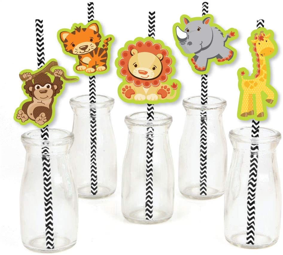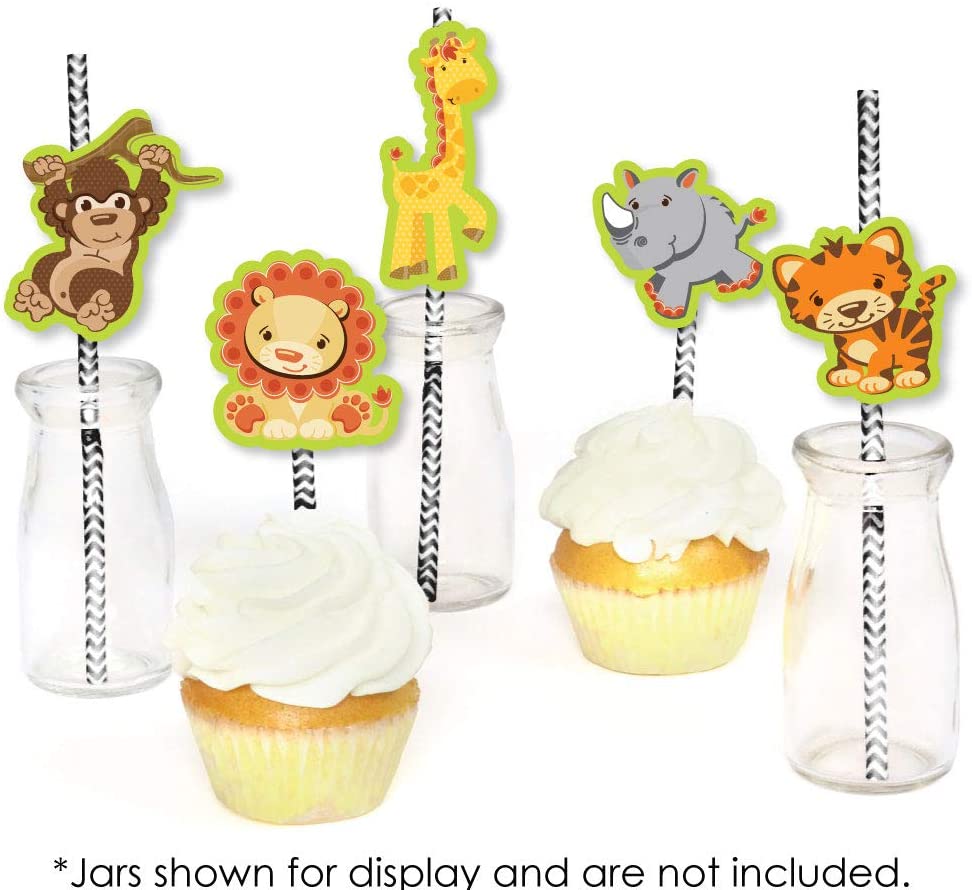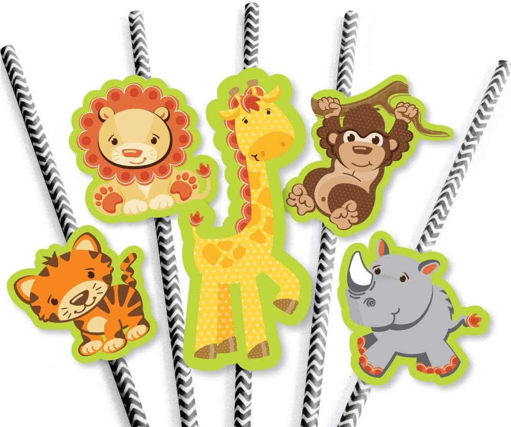 Funfari - 有趣的野生动物园丛林吸管装饰派对套装尺寸:4 只长颈鹿,1.5 英寸宽 x 3.75 英寸高;5 只犀牛,2.25 英寸宽 x 2.25 英寸高;5 只狮子,2.25 英寸宽 x 2 英寸高;5 只猴子,2.25 英寸宽 x 3 英寸高;5 只老虎,2.25 英寸宽 x 2.25 英寸高;以及 25 根 V 形条纹纸吸管,7.75 英寸高。