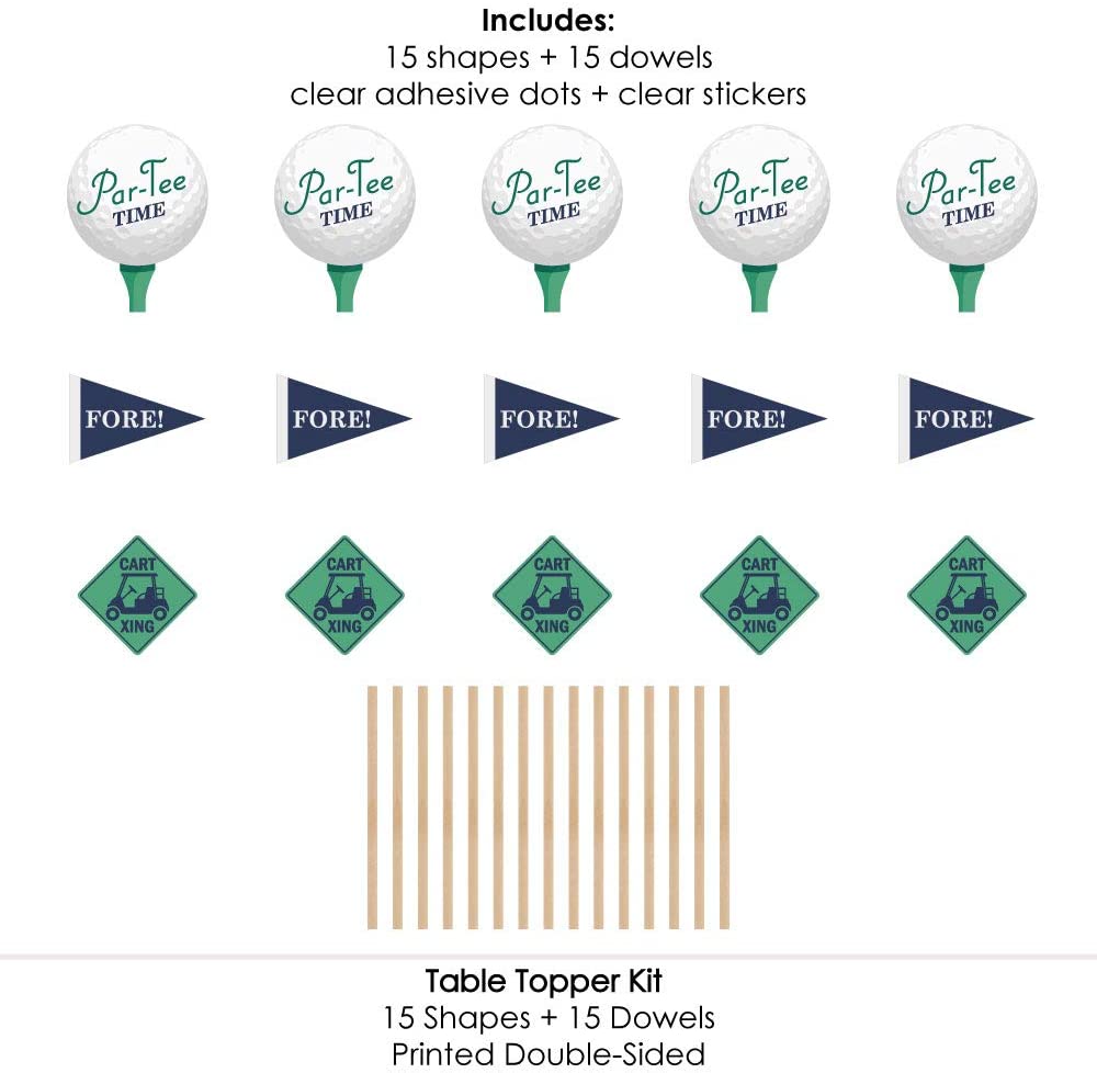 Par-Tee Time - 高尔夫桌面装饰棒包含 15 个三种不同形状的 Par-Tee Time - 高尔夫桌面装饰、15 根木钉以及方便组装的贴纸。高尔夫派对桌面装饰非常适合退休派对或生日派对。
