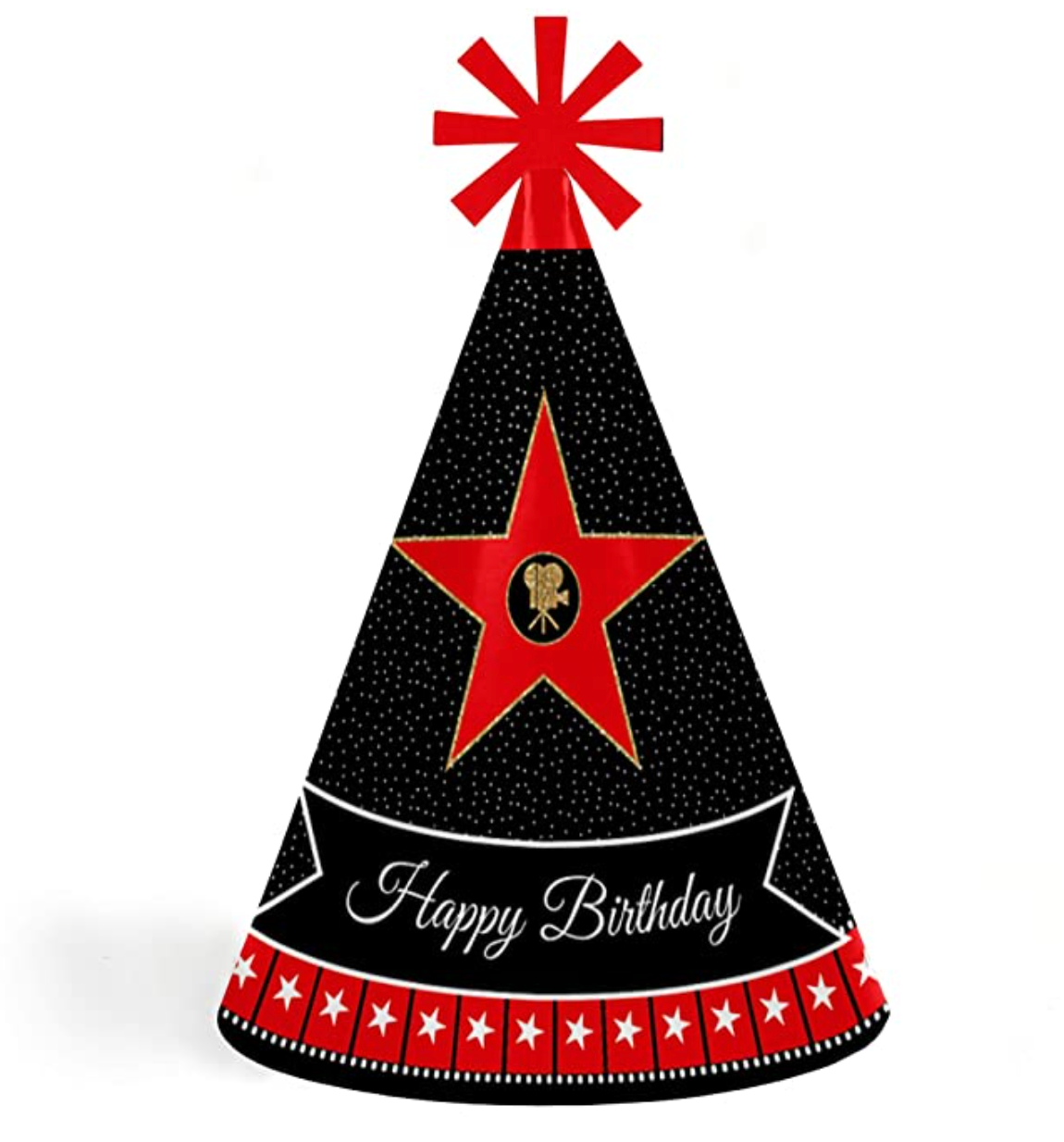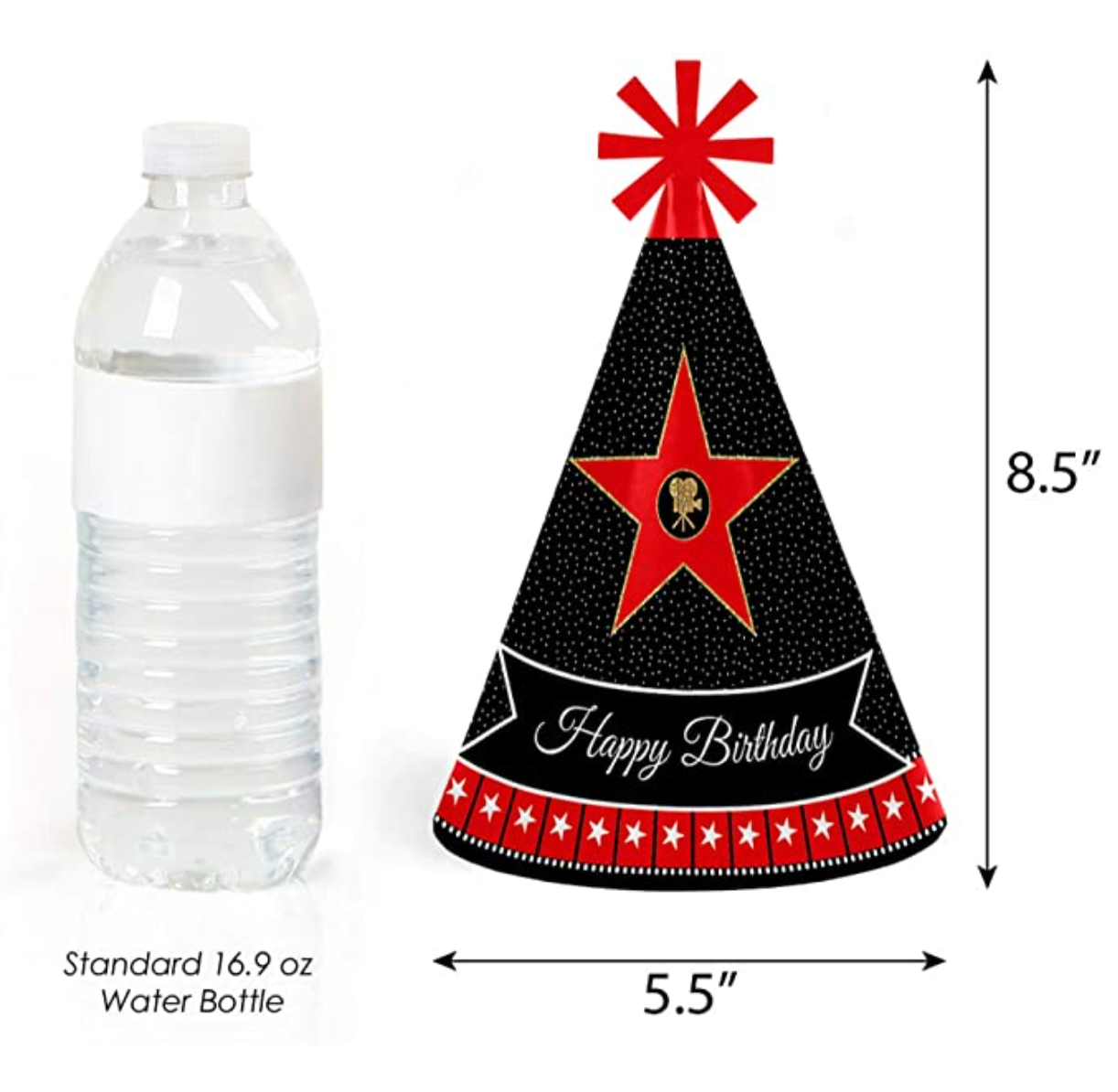 红毯好莱坞 (Red Carpet Hollywood) 帽子尺寸:高 8.5 英寸,底部直径 5.5 英寸。附带的弹性下巴带长 12 英寸。每顶有趣的红毯好莱坞 (Red Carpet Hollywood) 派对帽顶部均饰有独特的星形镂空装饰,正面印有“生日快乐”字样。