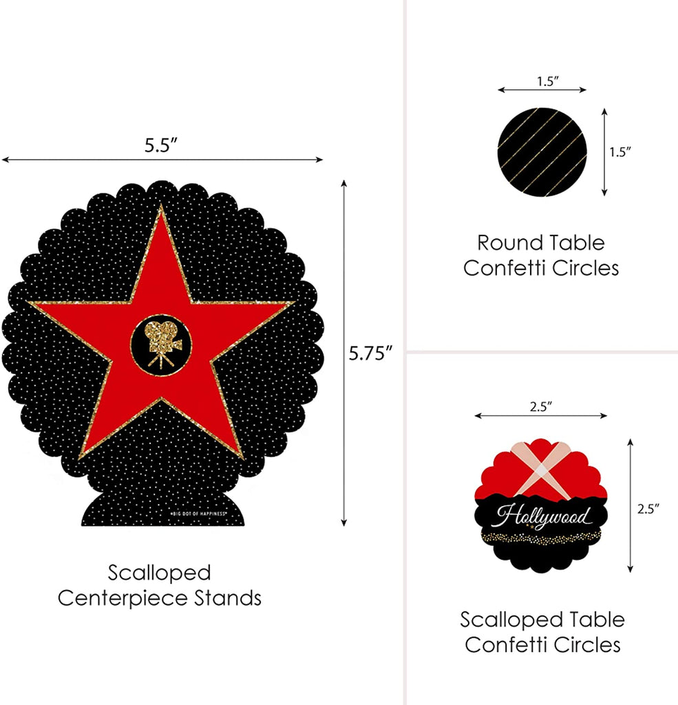 红毯好莱坞 (Red Carpet Hollywood) 桌饰套装包含 1 个大型舞会、返校节、单身派对或生日派对中心装饰,2 个扇形中心装饰,12 个扇形桌面彩纸和 24 个圆形桌面彩纸。红毯好莱坞 (Red Carpet Hollywood) 桌饰是派对的完美之选。