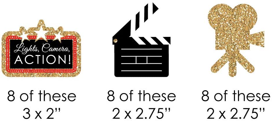 电影吸管装饰派对套件尺寸:8 个灯光、摄像机、动作 3 英寸宽 x 2 英寸高;8 个导演场记板 2 英寸宽 x 2.75 英寸高;8 个复古电影摄影机 2 英寸宽 x 2.75 英寸高和 25 根 V 形条纹纸吸管 7.75 英寸高。