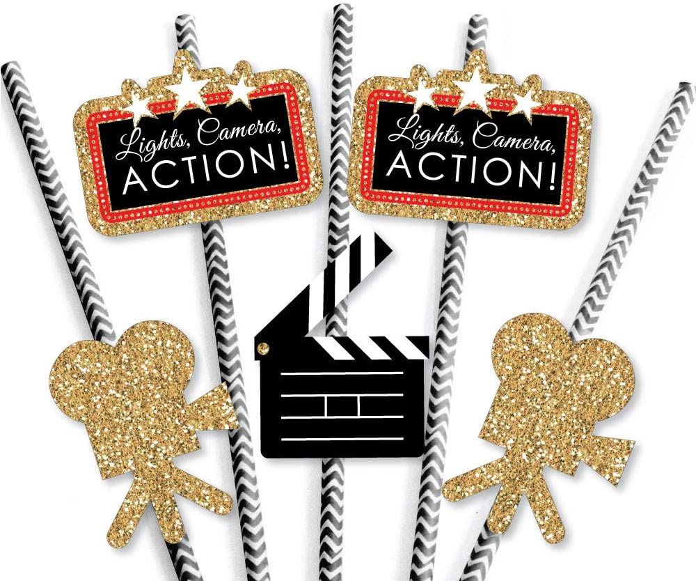红地毯好莱坞 - 纸质吸管装饰 - 电影之夜派对条纹装饰吸管 - 24 件套