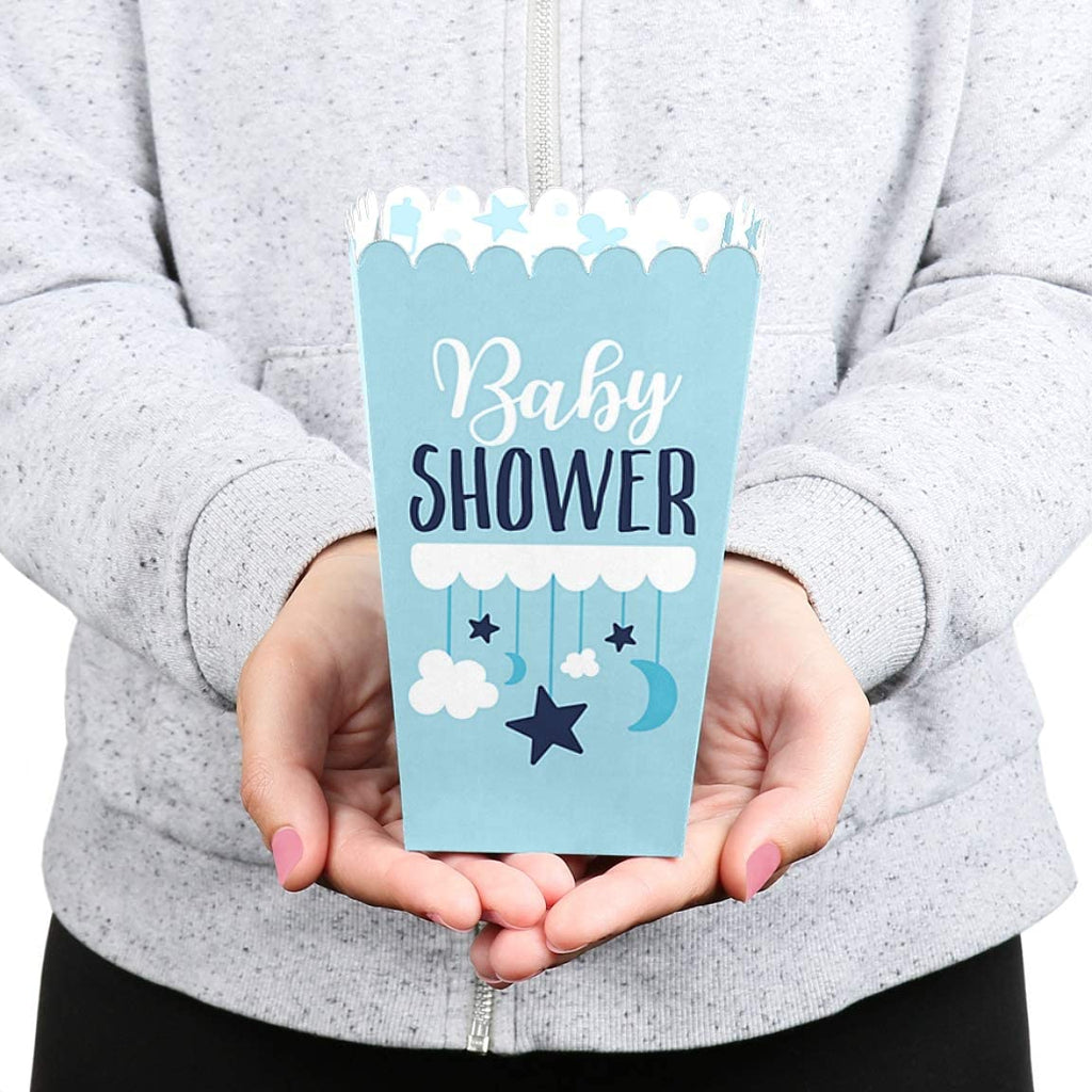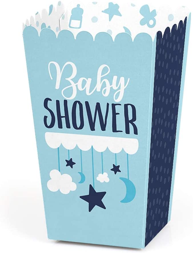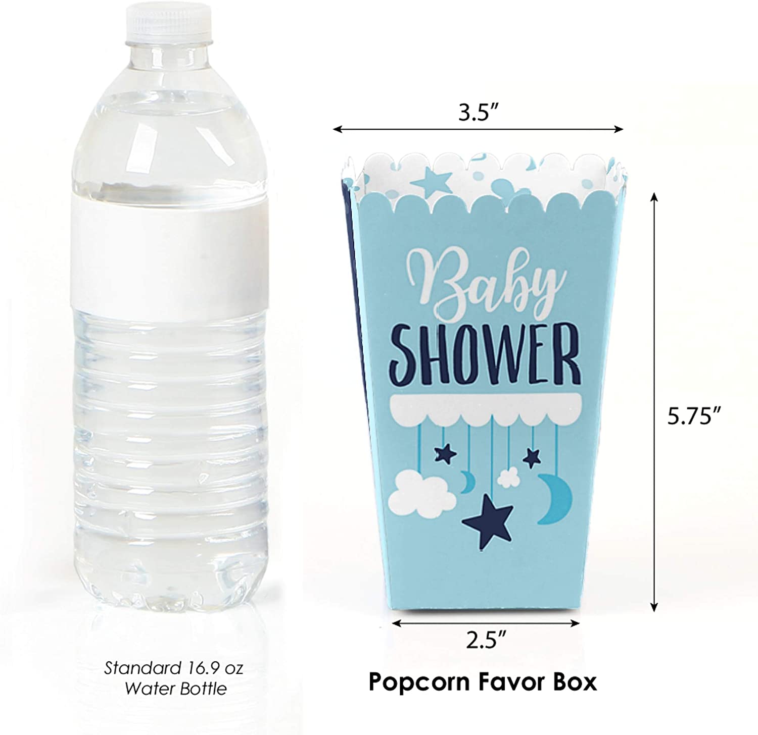 这是男孩派对特制爆米花礼盒,尺寸为高 5.75 英寸 x 顶部正方形 3.5 英寸。独特的设计和大尺寸,使这 12 个蓝色爆米花礼盒成为迎婴派对的必备之选。