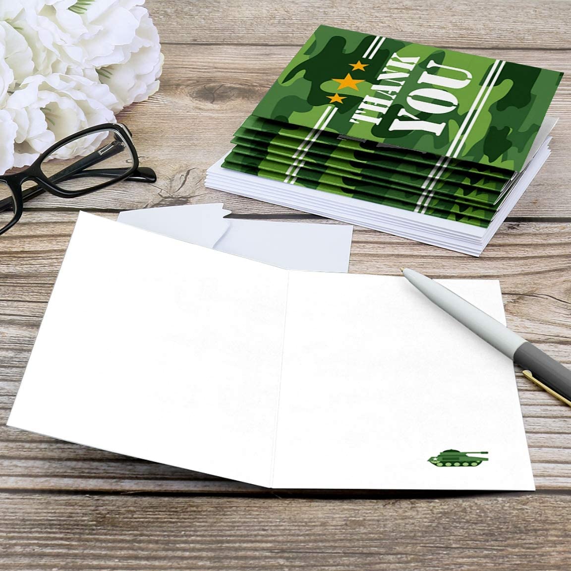 迷彩英雄感谢卡套装包含8张迷彩派对感谢卡和优质白色信封。迷彩英雄感谢卡适合任何场合。陆军主题非常适合迎婴派对或生日派对。