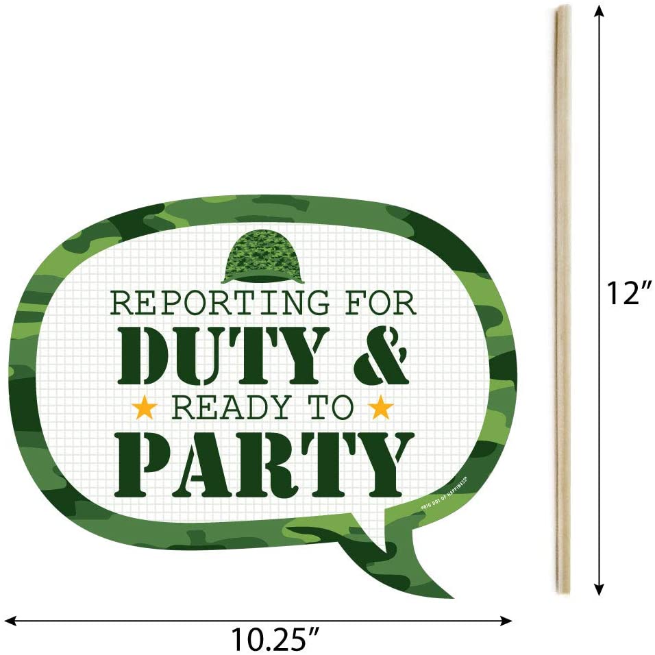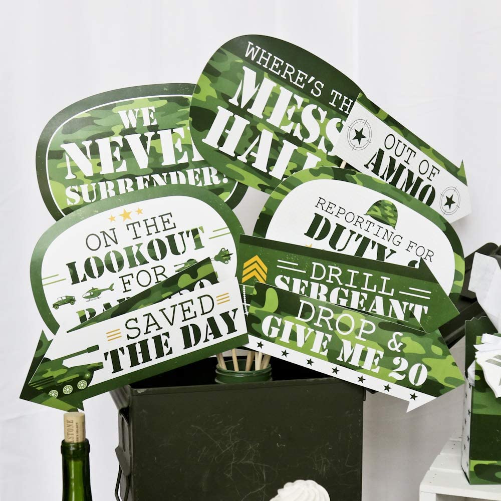 军队派对装饰:这些可爱的拍照道具有很多有趣的使用方法!按预期使用,拍摄派对照片分享;将它们添加到花瓶和插花中,作为有趣的军事婴儿送礼会或生日中心装饰;将它们放在药剂师糖果罐中展示,为您的迷彩婴儿送礼会或生日糖果自助餐增添亮点;将它们作为方向箭头粘贴在墙壁上,并引导您的客人参加军队婴儿送礼会或生日派对!
