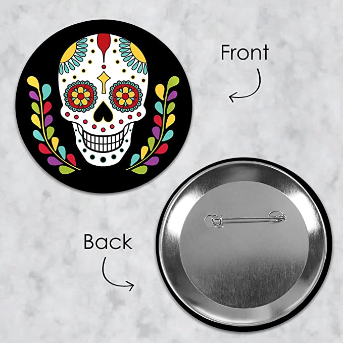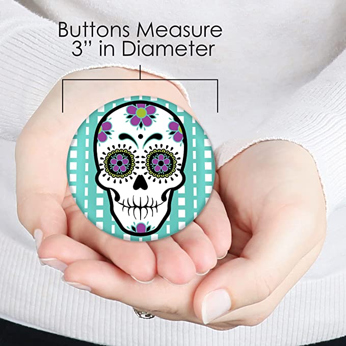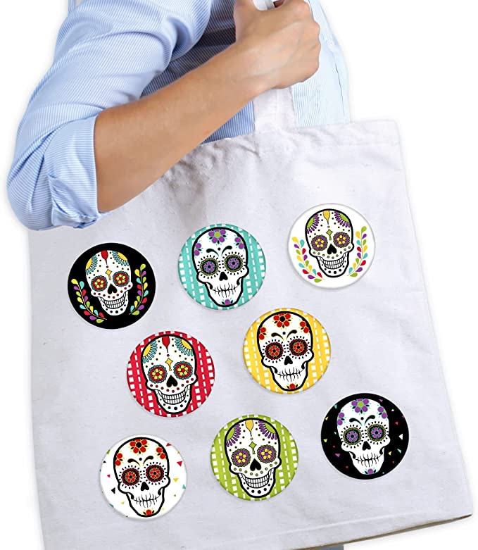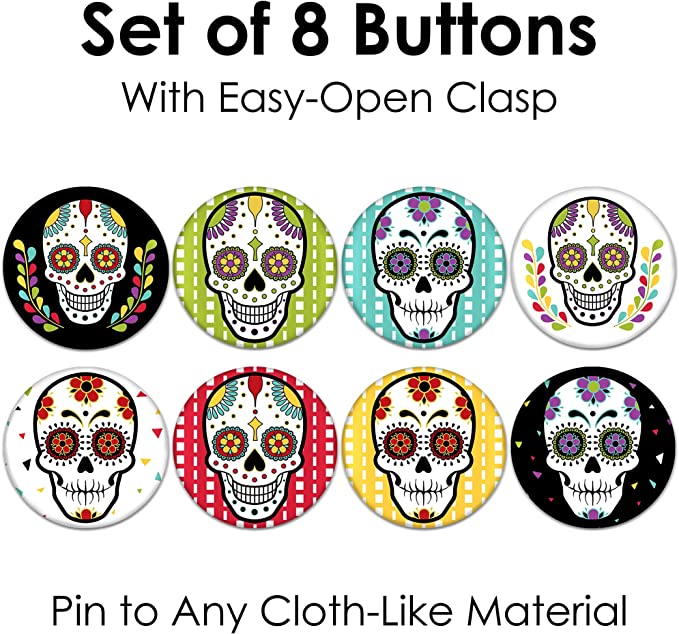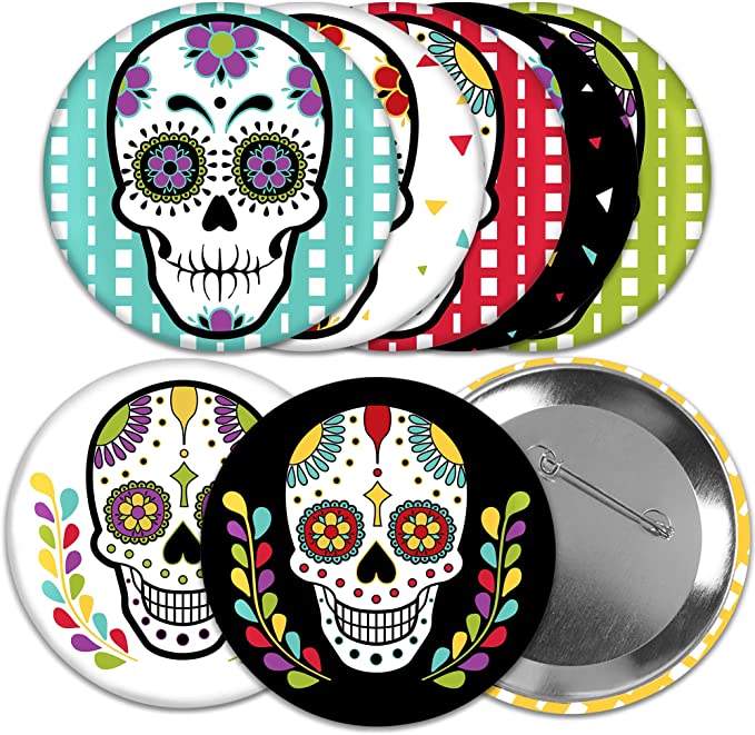 亡灵节 - 3 英寸万圣节糖骷髅派对徽章 - 别针纽扣 - 8 件套