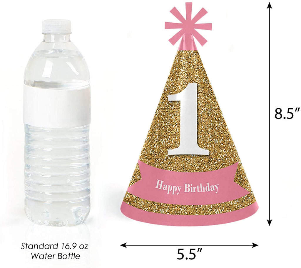 一岁生日女孩帽子尺寸:高 8.5 英寸,底部直径 5.5 英寸。附带的弹性下巴带长 12 英寸。每顶有趣的粉色和金色派对帽顶部均饰有独特的星形镂空装饰,正面印有“生日快乐”字样。