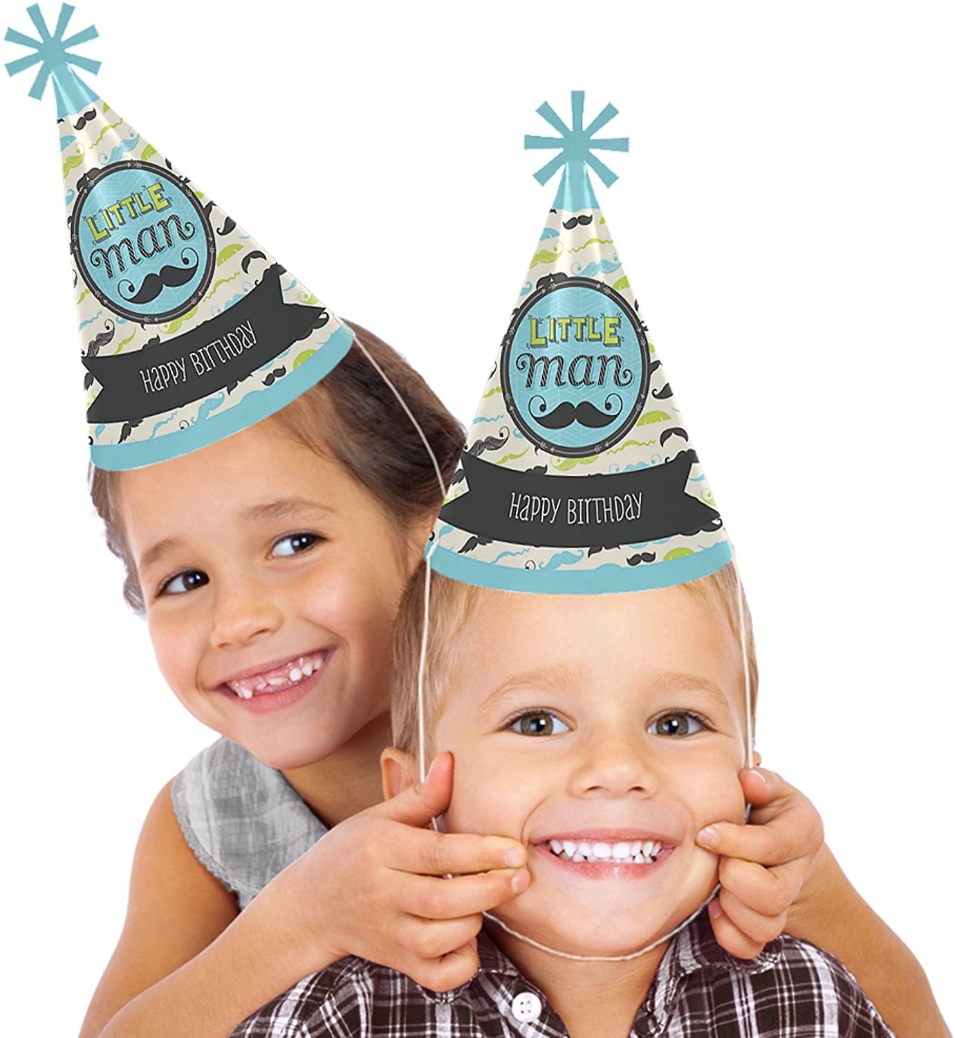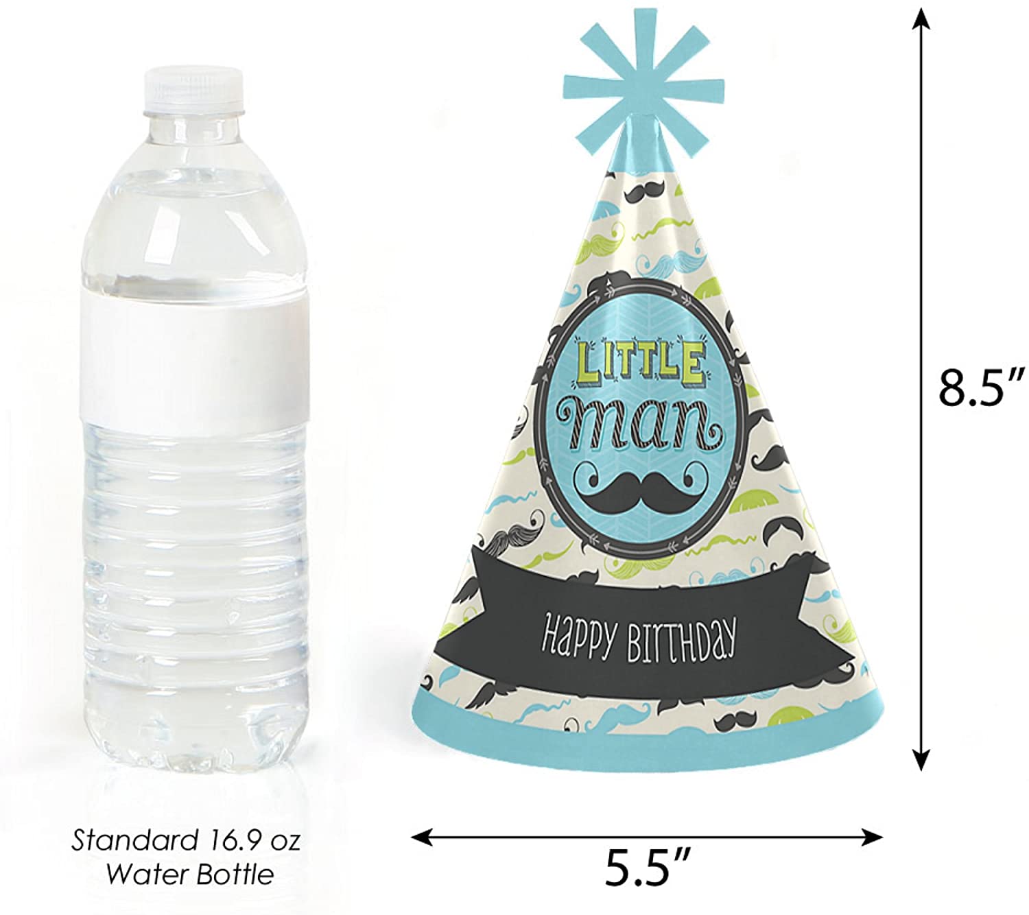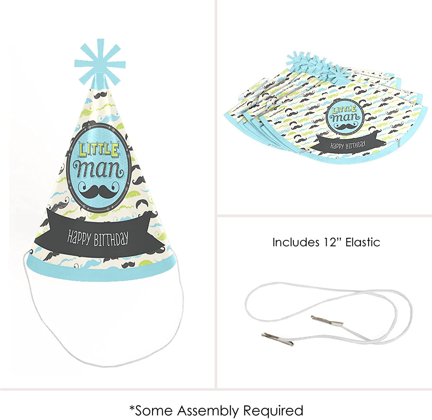 帅气小男人胡子派对帽,高 8.5 英寸,帽底直径 5.5 英寸。附带的弹性下巴带长 12 英寸。每顶帽子顶部都饰有独特的星形镂空装饰,正面印有“生日快乐”字样。