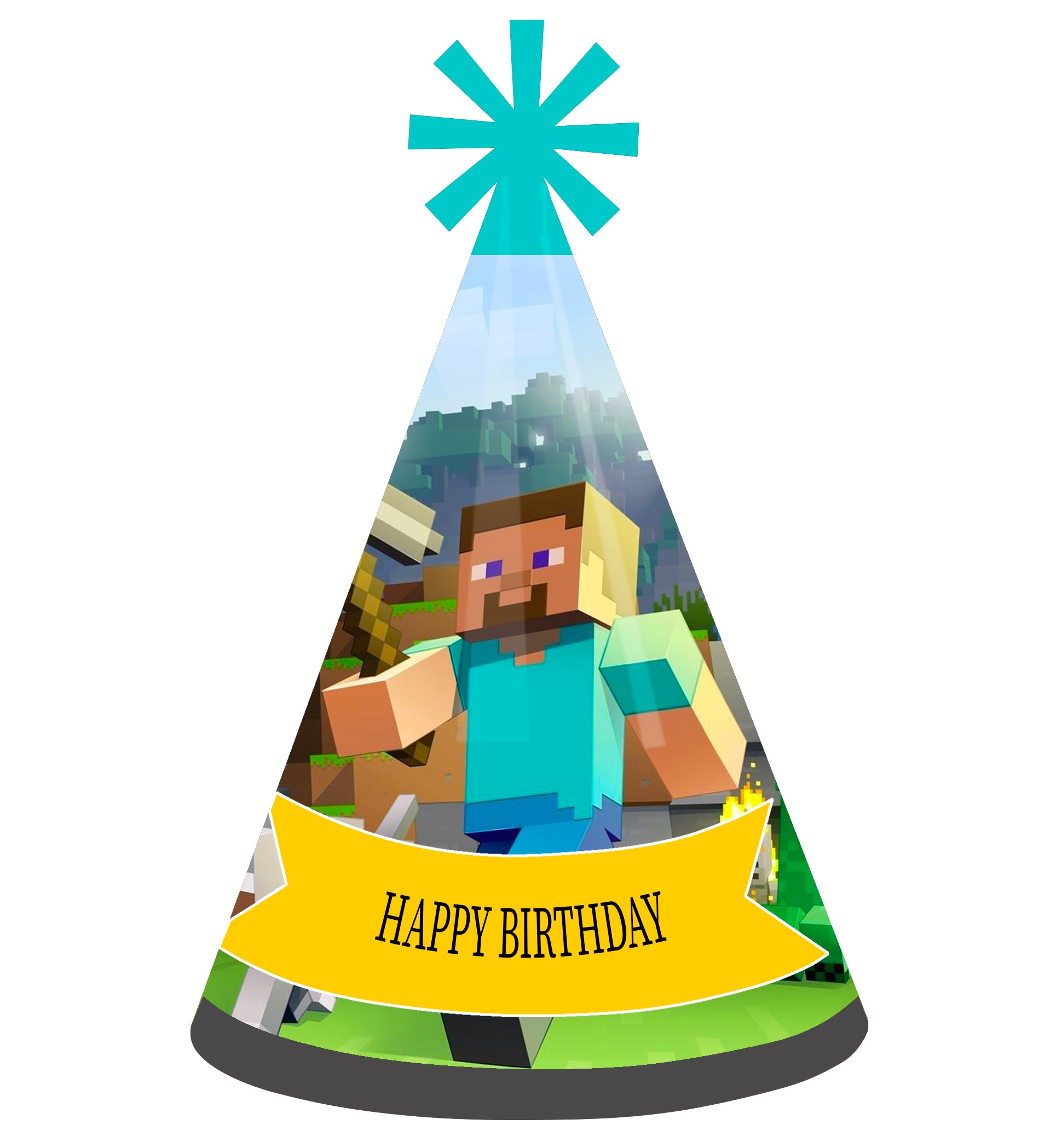 Minecraft 帽子套装包含 8 顶锥形成人派对帽,帽檐装饰,配有弹性下巴带。派对帽尺寸较大,但成人和儿童均可佩戴。只需简单快速地组装即可。