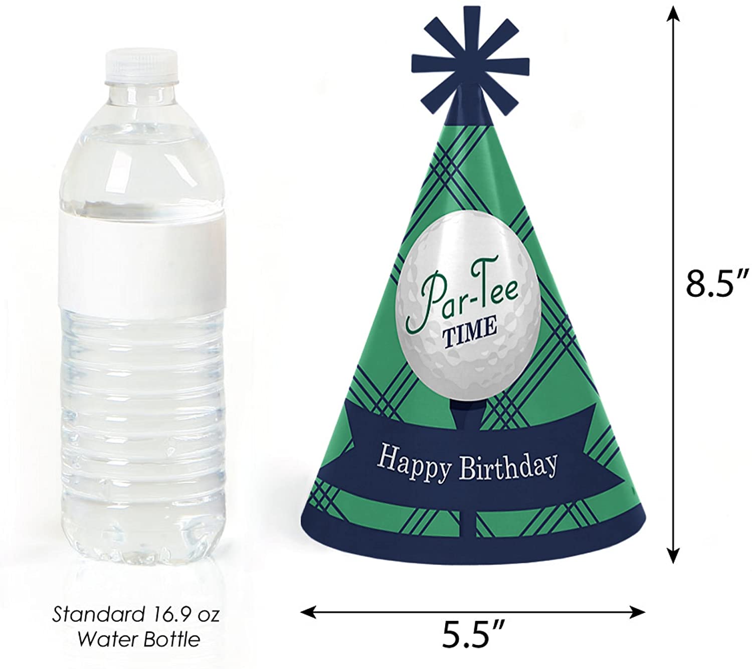 Par-Tee Time - 高尔夫帽尺寸:高 8.5 英寸,帽底直径 5.5 英寸。附带的弹性下巴带长 12 英寸。每顶趣味十足的高尔夫派对帽顶部均饰有独特的星形镂空装饰,正面印有“生日快乐”字样。