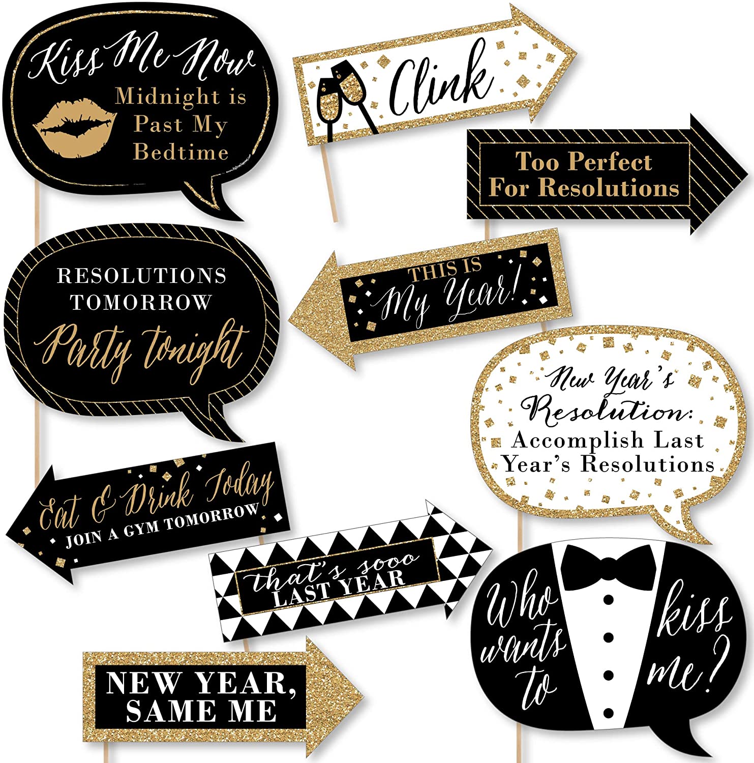 10件套趣味新年夜拍照亭道具套装,包含10个新年夜主题的金色箭头和对话泡泡拍照亭道具、10根木钉以及组装贴纸。组装简便:只需将印好的DIY拍照亭道具用附带的加固贴纸粘贴到木钉上即可。